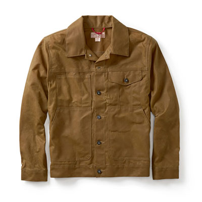 This xsmall, tan Filson short cruiser is a trimmer fitting, shorter length jacket with an oil finish and a hanging loop on neck.