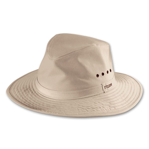 This small, desert tan Filson Summer Packer Hat is breathable and waterproof providing sun protection with its 2.75" wide brim and UPF 50+ rating.