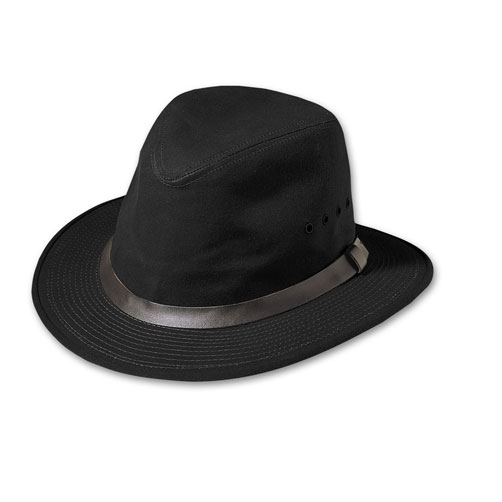 Constructed from rugged Tin Cloth to withstand the harshest of elements. Features water-repellent oil finish treatment, cotton sweatband, leather hatband, side vents, and a 2 1/4" brim. Made in USA.