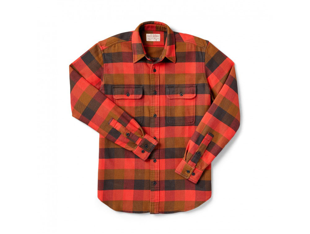 This large, red mackinaw Filson Vintage Flannel Work Shirt is a warm cotton, botton-down which features button adjustable cuffs, cotton and brushed twill fabric, and is cut for mobility.