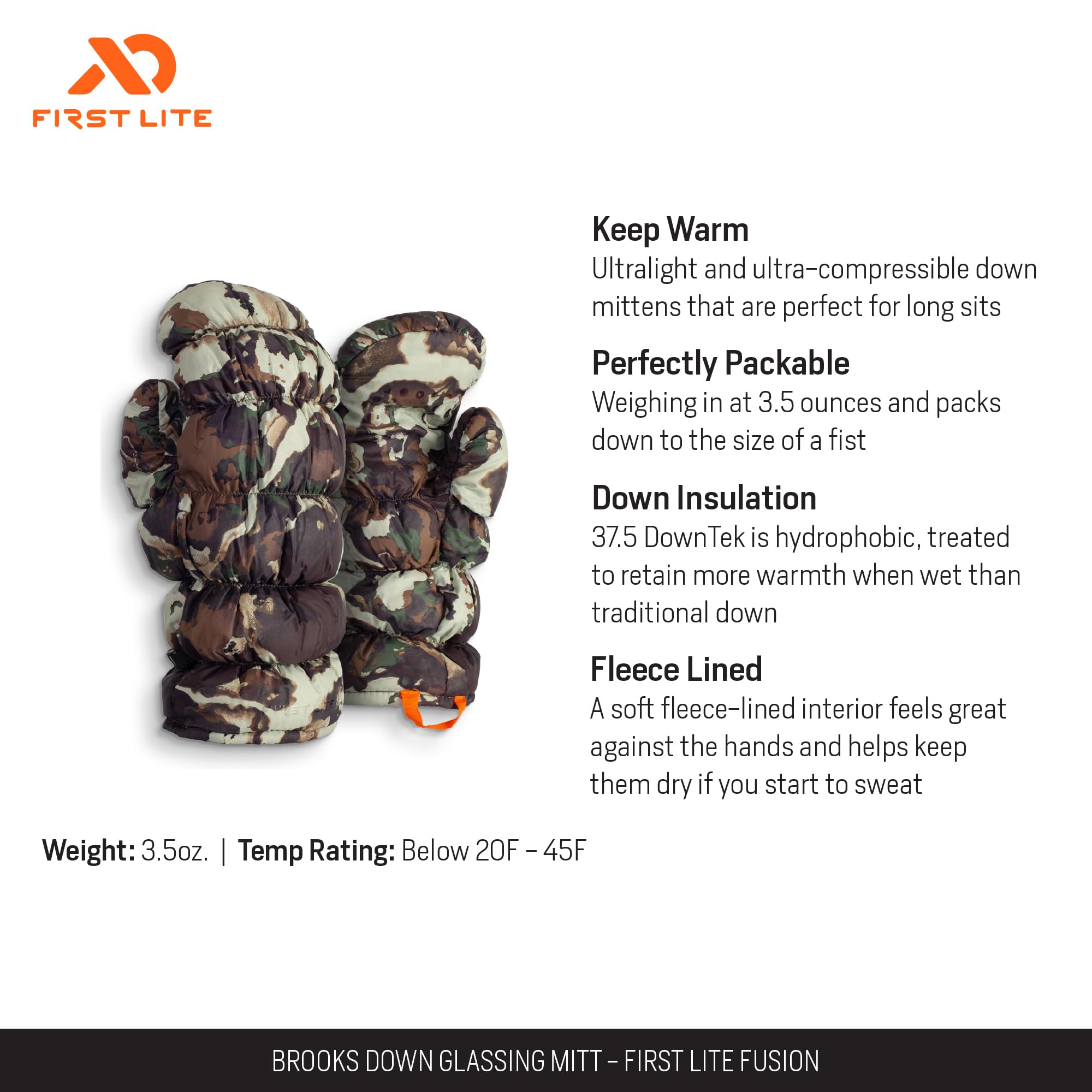 Engineered for those who demand reliable warmth and performance in the harshest environments, the First Lite Brooks Down Glassing Mitt in Fusion camo is the ultimate companion for cold-weather pursuits. Designed for the dedicated outdoorsman, these mitts combine advanced insulation and rugged construction, ensuring your hands stay protected and agile during long hours in the field. The mitts' innovative glassing design allows for precise movement and a secure grip, making them a top choice for hunters and adventurers who refuse to compromise on dexterity. The various sizing options offer a comfortable, secure fit, while the Fusion camo pattern blends seamlessly into a variety of terrains, keeping you concealed and focused on the task at hand. Whether you're glassing for game at dawn or braving a winter expedition, these mitts deliver the warmth, durability, and performance you need to stay in the hunt.