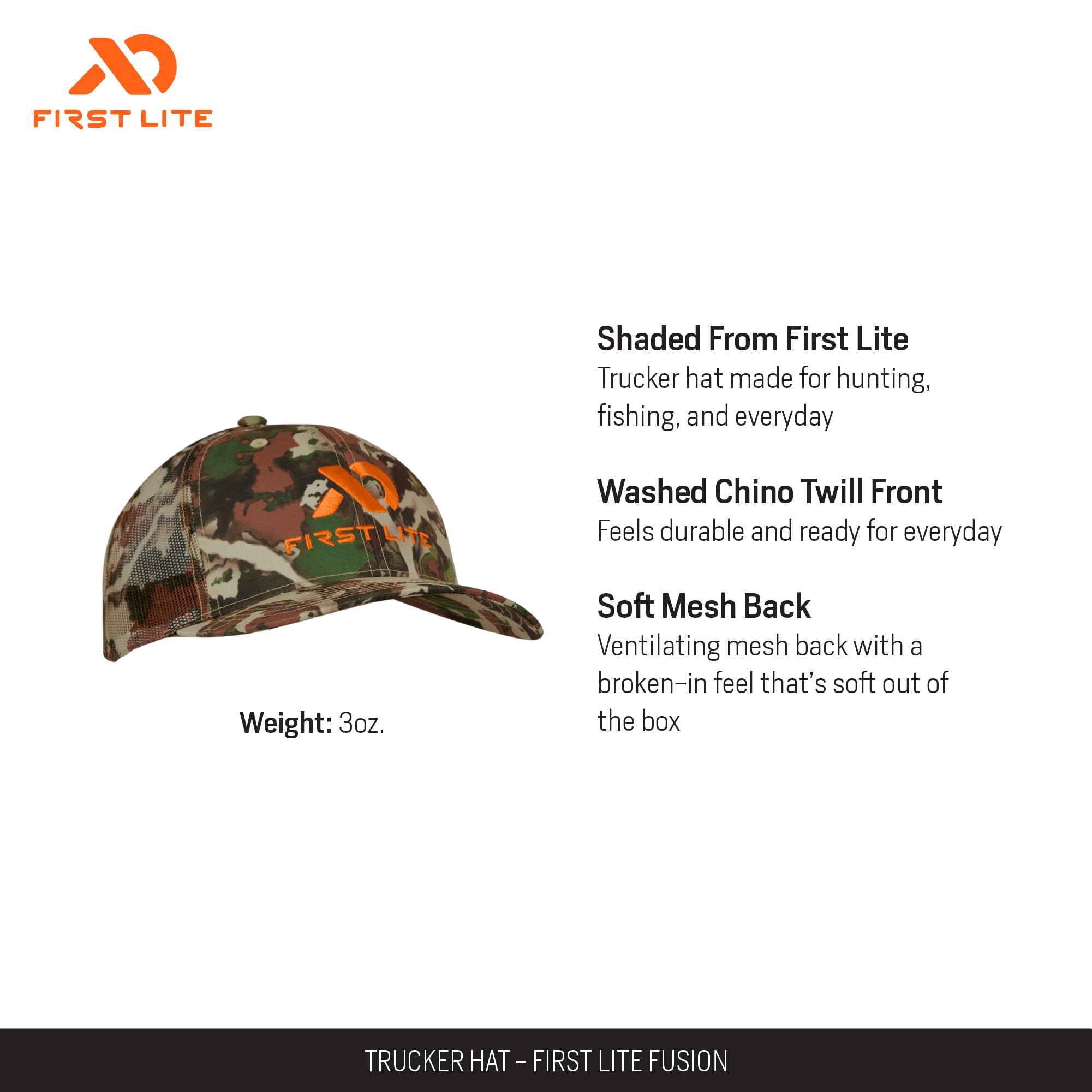 Designed for those who live for the outdoors, the First Lite Trucker Hat in Fusion OS MATRKFUOS delivers the perfect blend of rugged style and reliable performance. Whether you're on the trail, in the blind, or just enjoying a day in the sun, this hat keeps you cool and comfortable thanks to its breathable mesh back. The Fusion OS color scheme sets you apart with a distinctive, modern look, while the First Lite branding signals your commitment to quality gear. Built to withstand the demands of your adventures, this hat is a dependable companion for any outdoor pursuit, and the adjustable snapback ensures a perfect fit for any head size.
