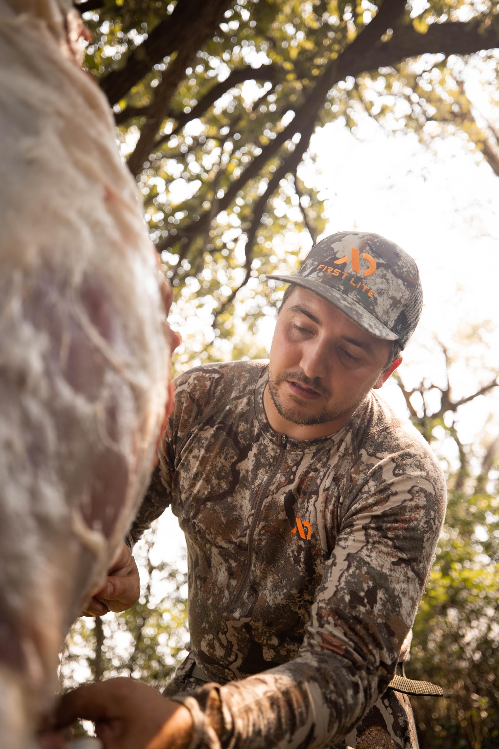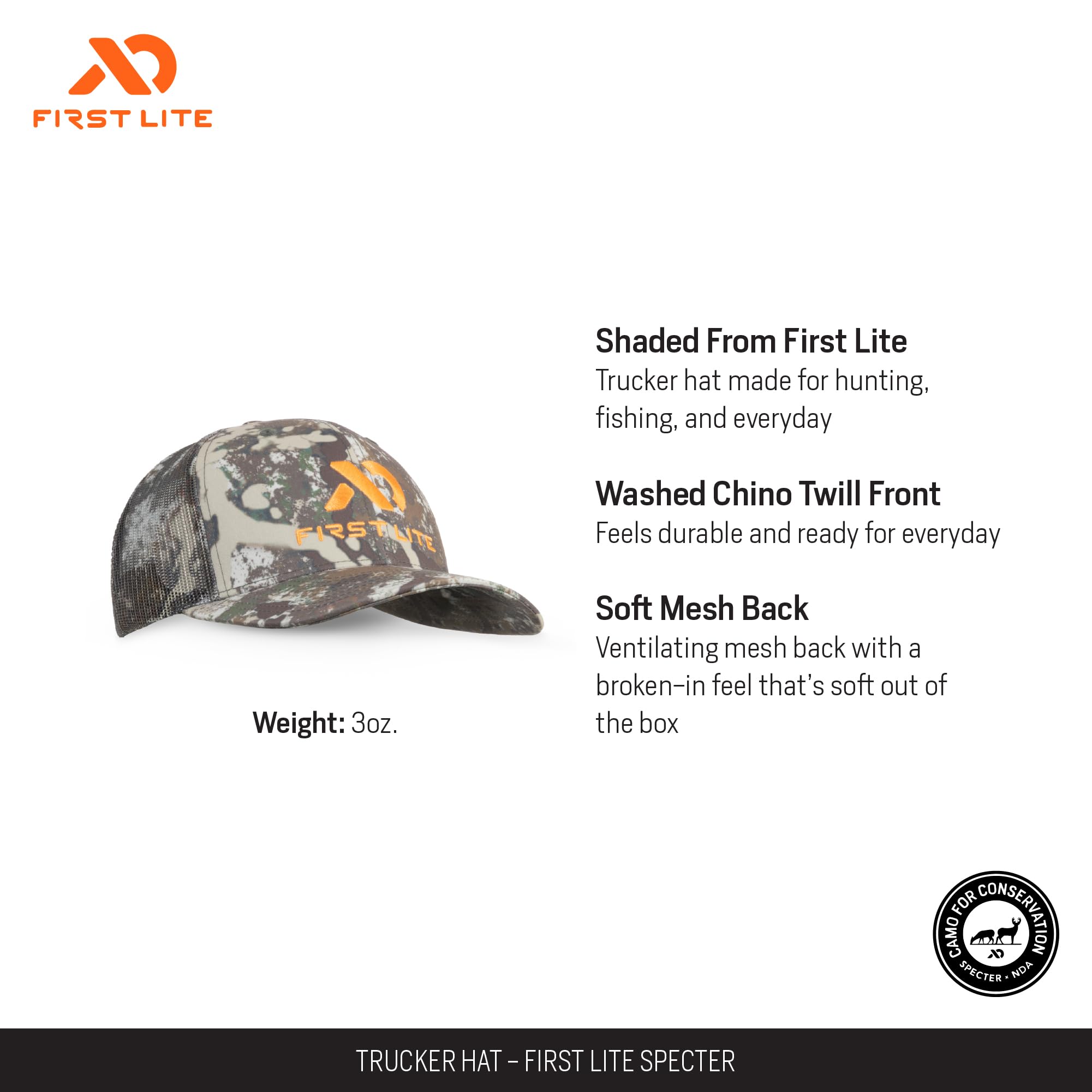 Whether you're heading out for a day in the field or just want to bring a touch of the wild to your everyday look, the First Lite Trucker Hat in Specter OS MATRKSPOS delivers the perfect blend of rugged style and practical comfort. Designed for the modern outdoorsman, this hat stands out with its iconic First Lite logo, a symbol of your commitment to the outdoors. The mesh back keeps you cool and comfortable, even during the most active pursuits, while the adjustable snapback ensures a perfect, secure fit for any adventure. Built to withstand the rigors of the outdoors, this hat is lightweight and durable, making it your go-to for everything from backcountry hunts to casual weekends.