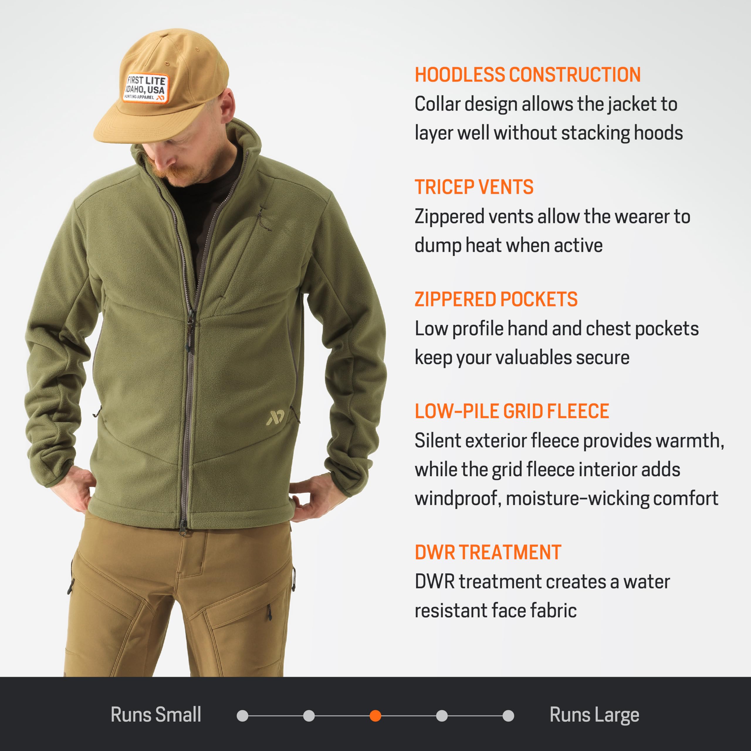 Experience the perfect blend of warmth, comfort, and versatility with the First Lite Men's Challis Fleece Jacket. Designed for the modern outdoorsman, this jacket is crafted from premium Challis fleece, delivering a soft, cozy feel that keeps you comfortable from the trailhead to the campfire. The conifer green color is inspired by the natural world, making it a stylish and adaptable choice for any adventure. Whether you're layering up for a brisk morning hike or wearing it for a casual outing, the jacket's thoughtful design ensures you're always prepared. The full front zipper allows for quick temperature regulation, and the multiple pockets provide secure, convenient storage for your essentials, so you can focus on the journey ahead.