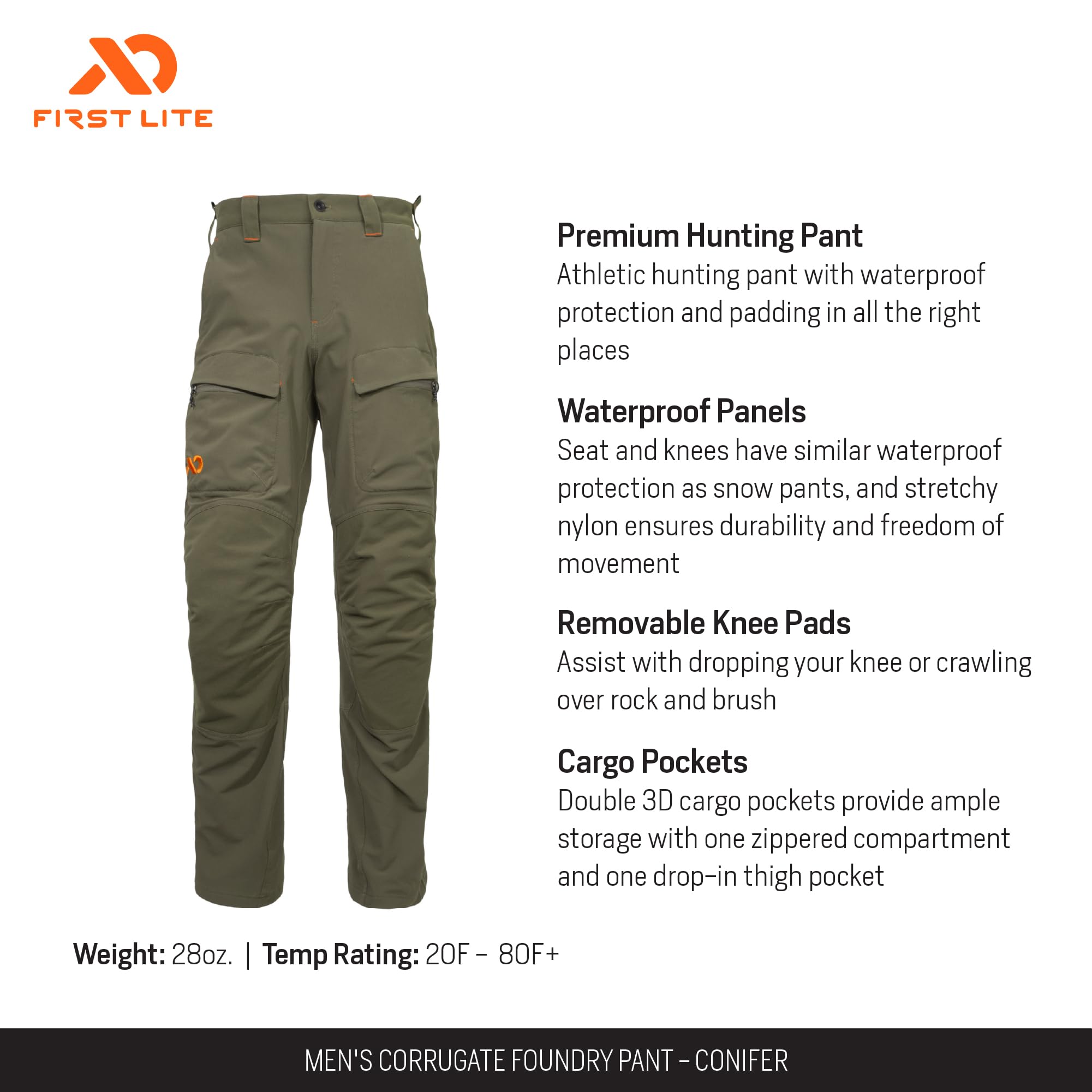 Engineered for the demands of the wild, the First Lite Men's Corrugate Foundry Pant in Conifer is the ultimate companion for the dedicated outdoorsman. These pants are crafted for those who refuse to compromise on durability or comfort, whether you're trekking through dense forests or navigating rugged terrain. The rugged fabric construction stands up to the harshest environments, while the tailored fit ensures freedom of movement for active pursuits. The Conifer green color is thoughtfully chosen to blend seamlessly with the natural landscape, providing the perfect balance of concealment and style. Designed with the needs of hunters and outdoor enthusiasts in mind, these pants are built to keep up with every adventure, season after season.