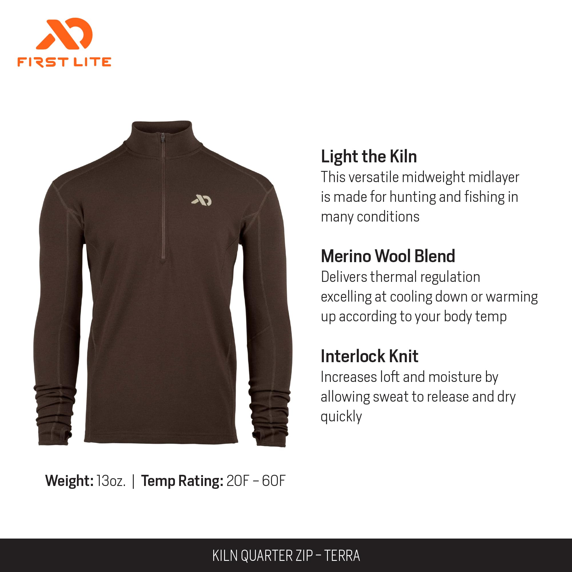 Experience the perfect balance of warmth, comfort, and adaptability with the First Lite Men's Kiln Quarter Zip. Crafted with the innovative Terra fabric, this pullover is designed to keep you cozy and protected, whether you're hitting the trail, setting up camp, or enjoying a laid-back weekend. The quarter zip design allows you to easily regulate your temperature, while the stand-up collar offers extra protection against the elements. The various sizing options ensure a relaxed, non-restrictive fit, making it a go-to choice for layering or wearing on its own. Built for the outdoors but stylish enough for everyday wear, the Kiln Quarter Zip is your reliable companion for any adventure.