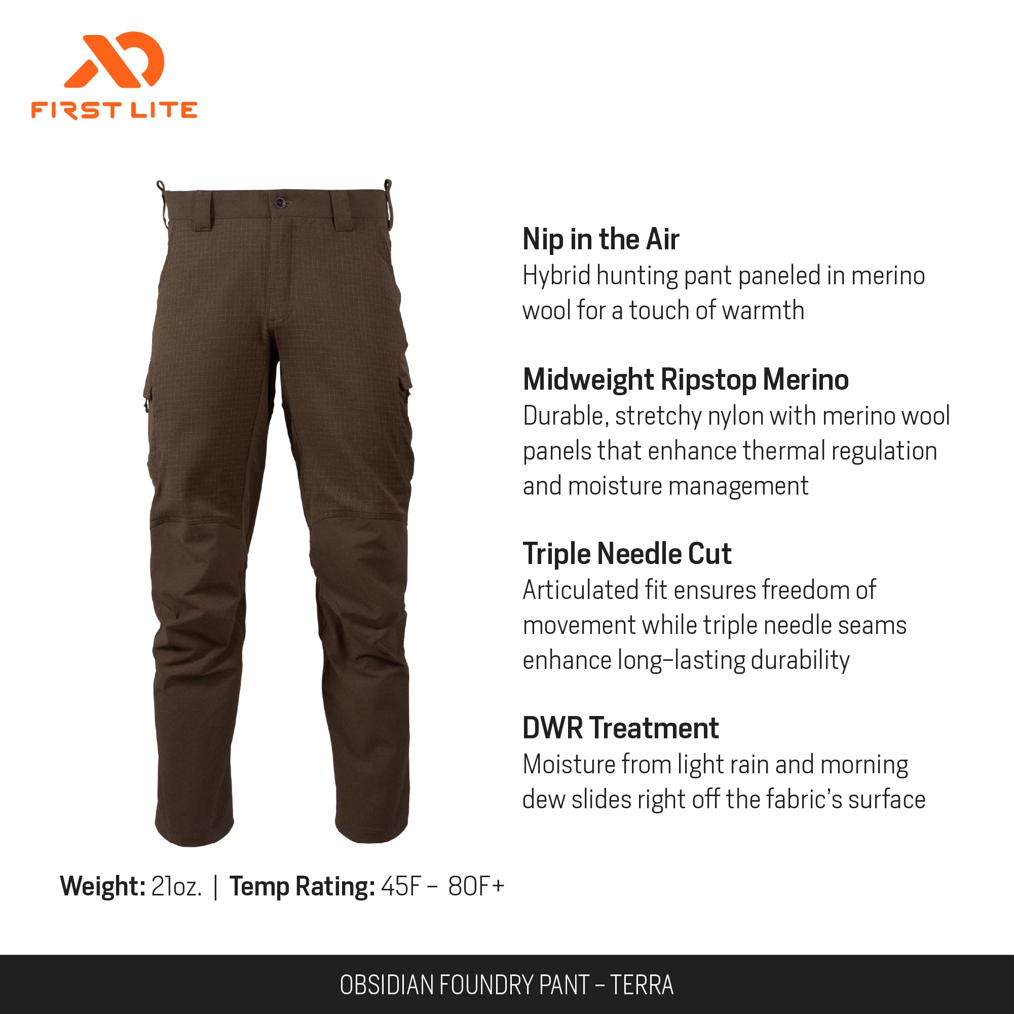 Engineered for those who demand performance and reliability in the wild, the First Lite Men's Obsidian Foundry Pant in Terra is the ultimate companion for your outdoor pursuits. Crafted for the rugged adventurer, these pants blend robust durability with thoughtful design, ensuring you stay comfortable and agile in the harshest environments. The articulated knees and tailored fit allow for unrestricted movement, whether you're scaling rocky trails or crouching in the underbrush. With ample, strategically placed pockets, your essential gear is always within reach, making these pants as practical as they are tough. Built to withstand the elements and the test of time, the Obsidian Foundry Pant is your go-to for hunting, hiking, and any demanding outdoor activity.