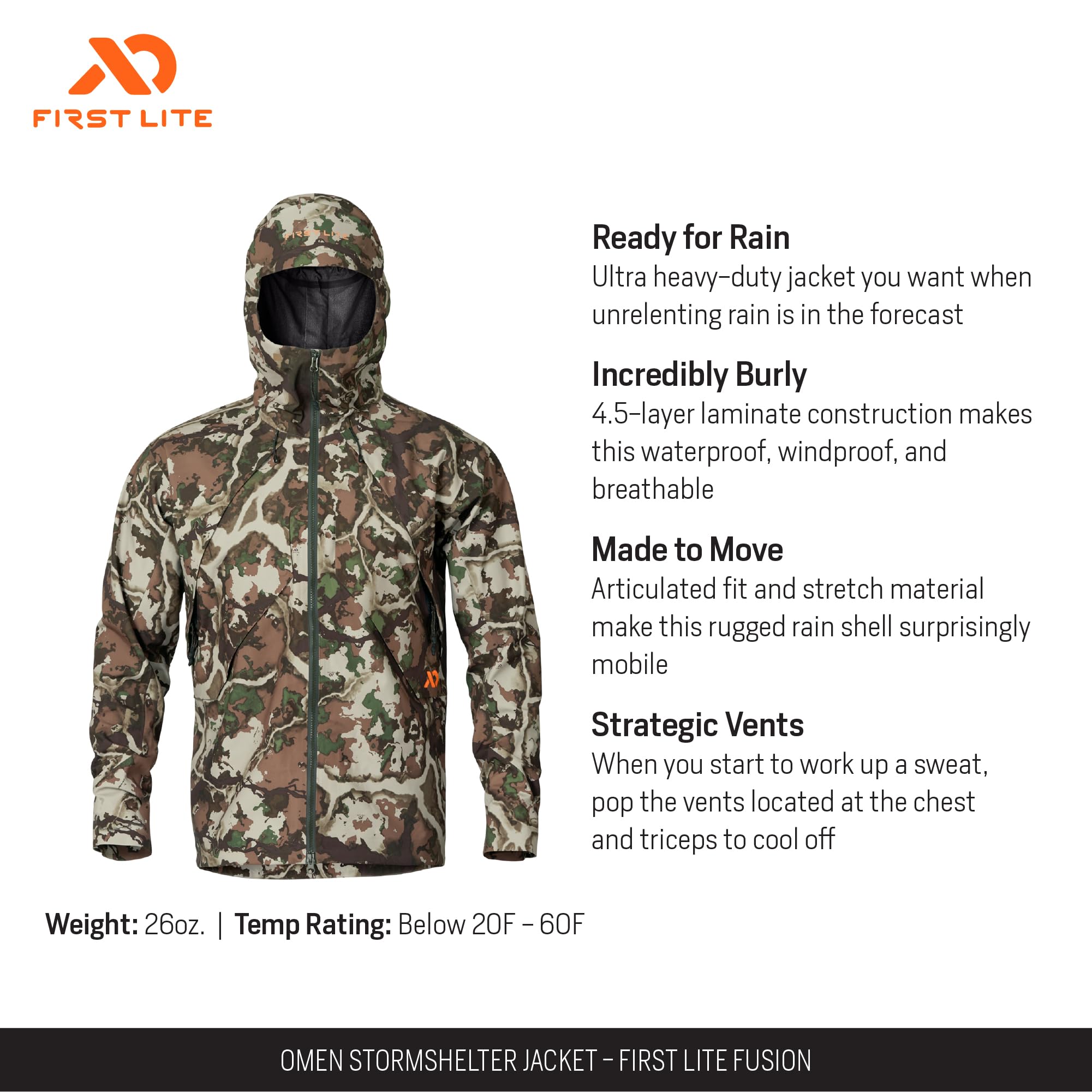 Engineered for those who refuse to let harsh weather stand in their way, the First Lite Men's Omen Stormshelter Jacket in Fusion is the ultimate companion for the outdoorsman who demands both performance and style. Crafted to withstand the most punishing conditions, this jacket is built for those who thrive in the wild, whether you're trekking through dense forests, scaling rocky ridges, or weathering a sudden downpour. The Omen Stormshelter is more than just a jacket--it's a reliable shield, offering a perfect blend of rugged durability and modern design. The advanced Fusion fabric and storm shelter hood ensure you're protected and comfortable, so you can focus on the adventure, not the weather. With a look that transitions seamlessly from the backcountry to the trailhead, this jacket is a must-have for anyone who values both function and form in their outdoor gear.