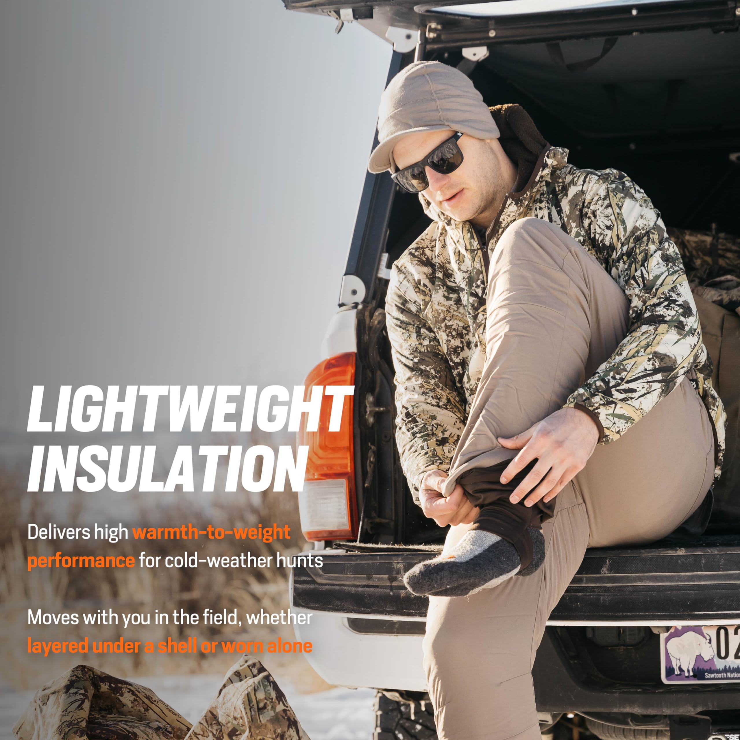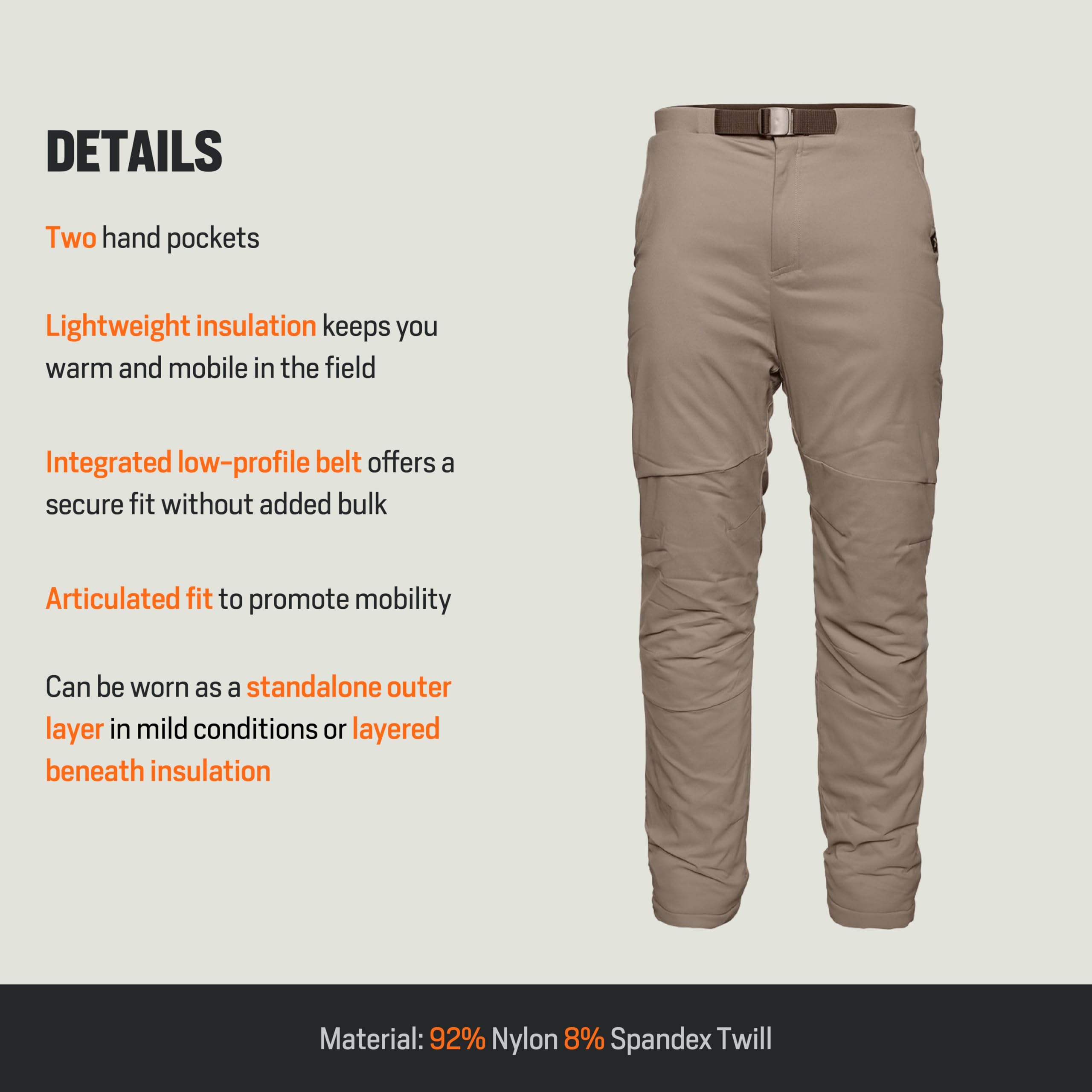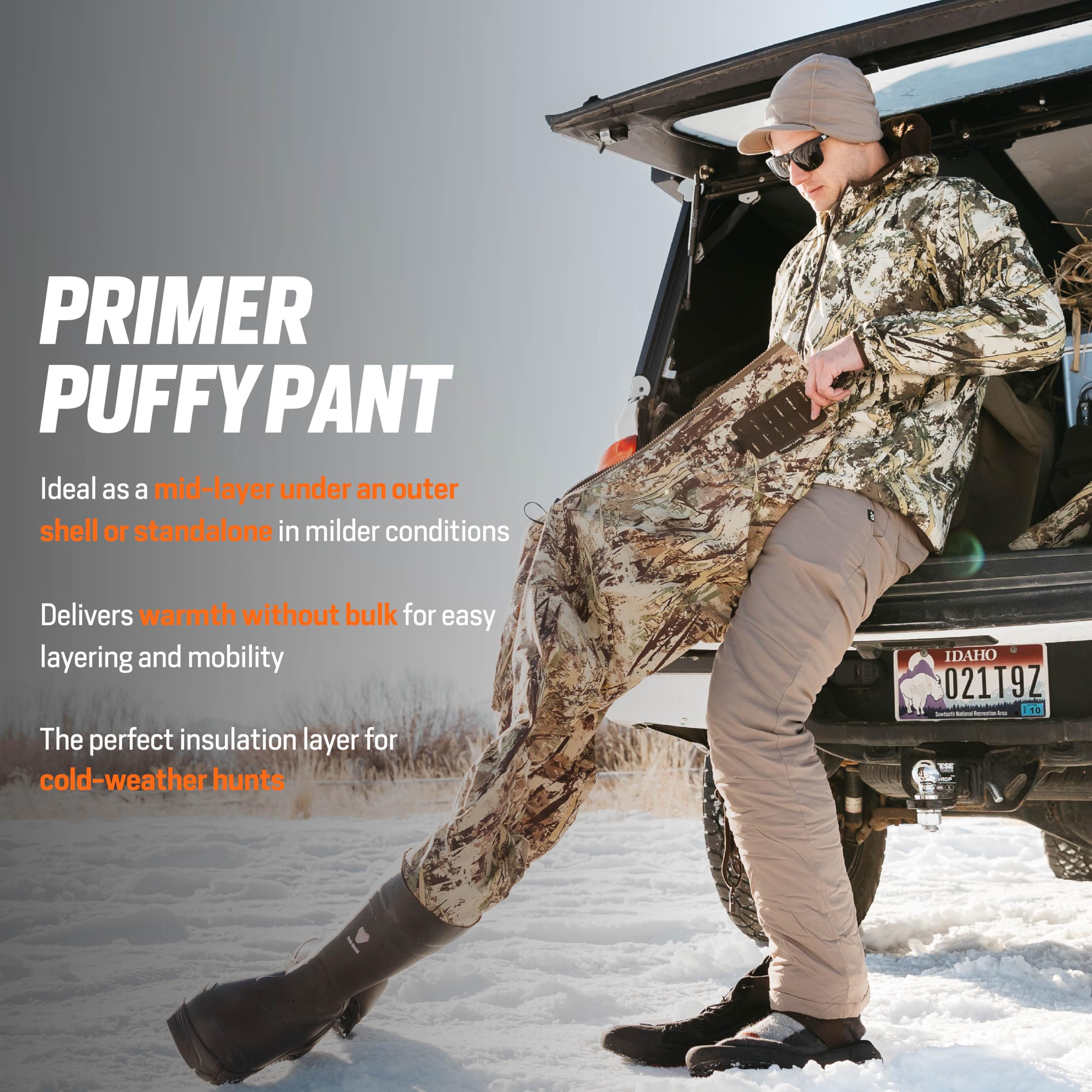 Stay warm and agile during your cold-weather pursuits with the First Lite Men's Primer Puffy Pant. Designed for the outdoorsman who demands both performance and comfort, these pants deliver reliable insulation without the bulk, making them the perfect companion for chilly mornings in the field, late-season hunts, or winter hikes. The walnut color blends seamlessly with natural surroundings, while the lightweight, durable construction ensures you can move freely and confidently, whether you're glassing from a ridge or setting up camp. The relaxedfit provides ample room for layering, so you can adapt to changing conditions without sacrificing comfort. Experience the perfect balance of warmth, mobility, and rugged style with the Primer Puffy Pant.