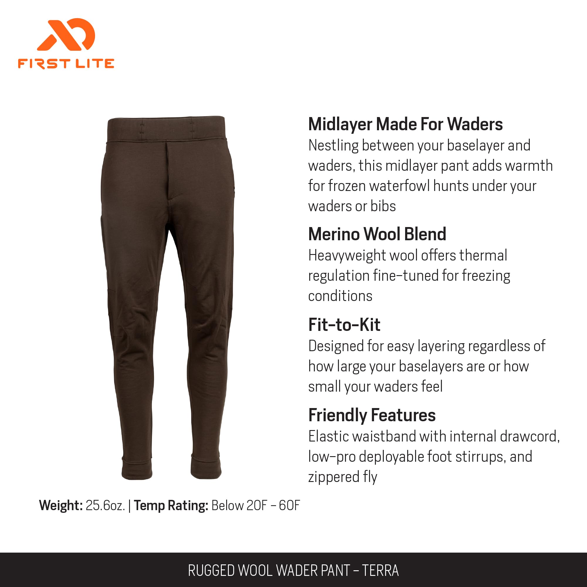 Engineered for the dedicated outdoorsman, the First Lite Men's Rugged Wool Wader Pant in Terra delivers the perfect blend of warmth, durability, and comfort for demanding environments. Crafted from robust wool, these pants are built to withstand the rigors of the wild, providing reliable insulation and moisture management in cold, wet conditions. The Terra colorway ensures you blend seamlessly into natural surroundings, making these pants an excellent choice for fishing, waterfowl hunting, and other outdoor pursuits. The various sizing options offer a non-restrictive fit, allowing for easy layering and unrestricted movement, so you can focus on the adventure ahead. Whether you're wading through icy streams or braving a chilly morning on the water, these pants are designed to keep you dry, warm, and comfortable from the first cast to the last light.