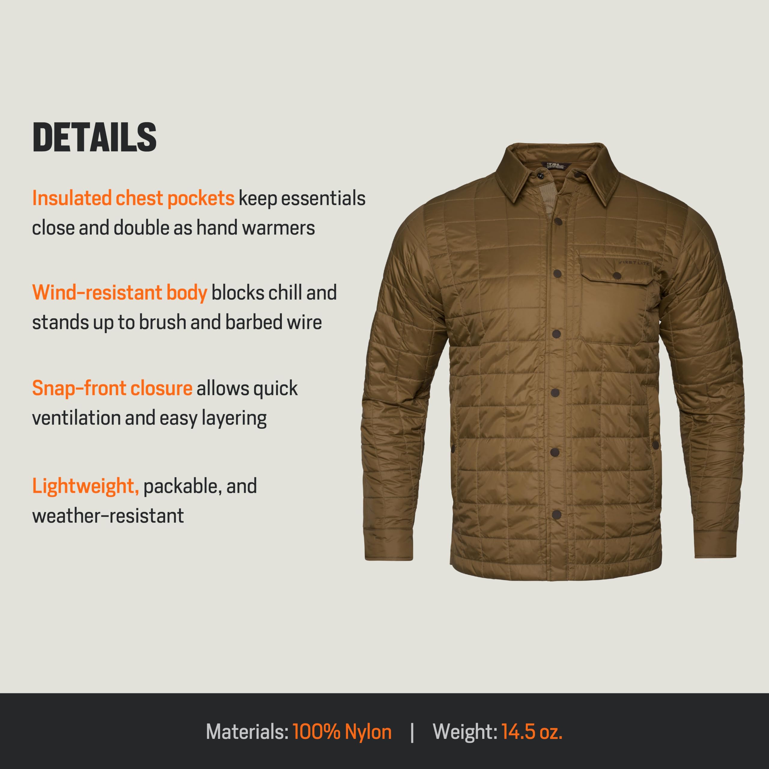 Discover the perfect balance of rugged durability and adaptable style with the First Lite Men's Scout Shacket in Dry Earth. Designed for the modern outdoorsman, this shacket seamlessly blends the classic look of a shirt with the reliable warmth and protection of a jacket. Its earthy Dry Earth color not only complements the natural landscape but also adds a touch of understated style to your outdoor and everyday wardrobe. Built to withstand the demands of the trail, campsite, or a casual day in town, the Scout Shacket is your go-to for layering in unpredictable weather. Its comfortable fit ensures freedom of movement, making it a reliable companion for hiking, camping, or simply enjoying the outdoors. Whether you're layering up for a brisk morning or need a versatile piece for your next adventure, this shacket is engineered to keep up with your active lifestyle.