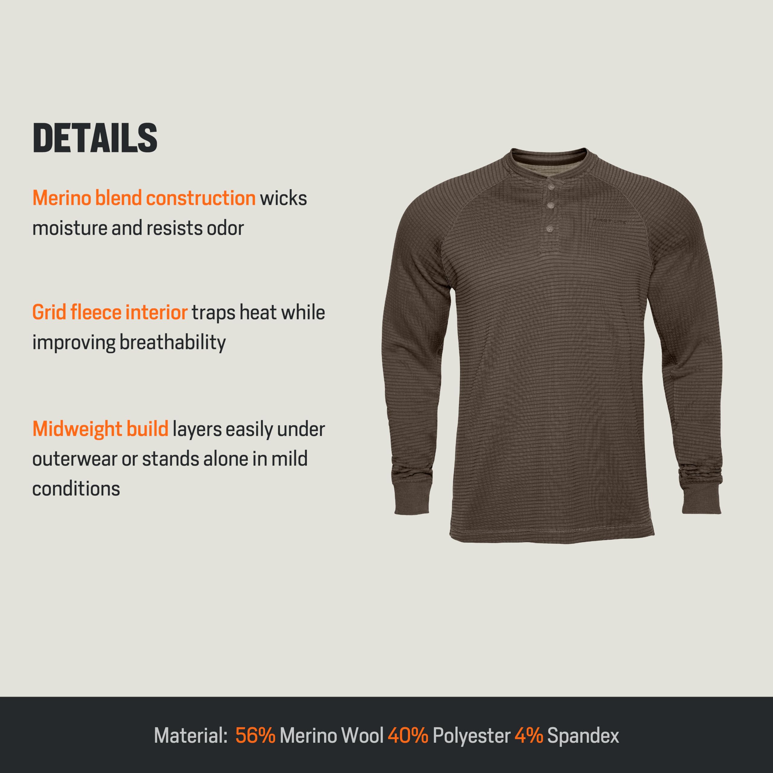 Experience unmatched warmth and versatility with the First Lite Men's ThermaGrid Merino Henley. Designed for the modern outdoorsman, this Henley combines the natural performance of Merino wool with the advanced ThermaGrid fabric, delivering the perfect balance of insulation and breathability. Whether you're layering up for a cold morning hunt or relaxing by the campfire, the Henley style and button placket offer adaptable comfort and a classic, rugged look. The Morel color and tailored fit ensure you look sharp and feel comfortable, no matter the adventure. Stay dry, odor-free, and ready for anything with this essential cold-weather staple.