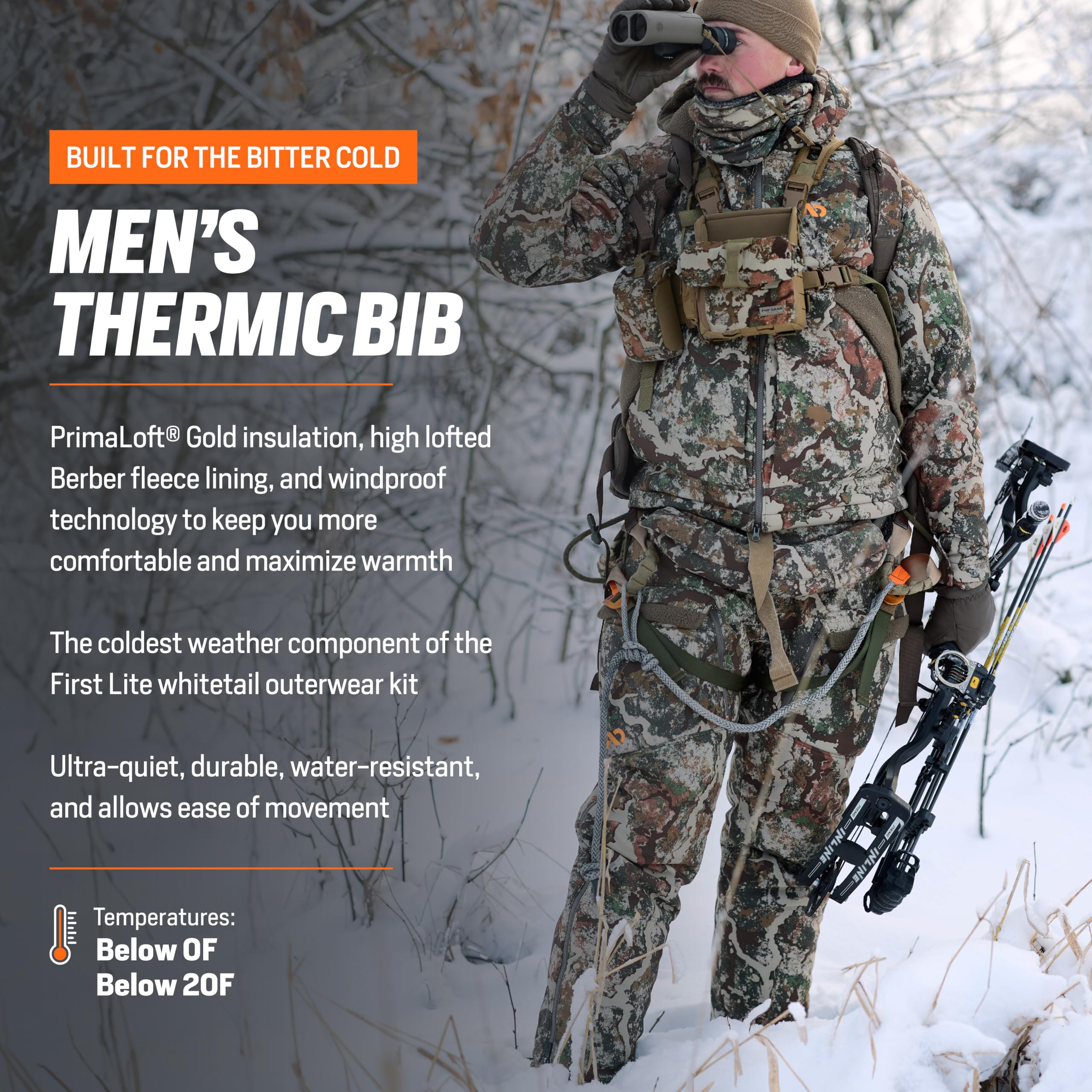 Engineered for those who demand reliable warmth and durability in the harshest conditions, the First Lite Men's Thermic Insulated Bib Pant in Specter is the ultimate companion for cold-weather pursuits. Designed for the dedicated outdoorsman, these bibs combine advanced Thermic insulation with a rugged, abrasion-resistant Specter fabric, ensuring you stay comfortable and protected, whether you're trekking through snow, setting up a blind, or tracking game. The adjustable bib straps provide a tailored, stay-put fit, allowing for a full range of motion and all-day comfort. Built for the rigors of the hunt and the unpredictability of the outdoors, these bibs are a must-have for anyone who refuses to let the cold slow them down.
