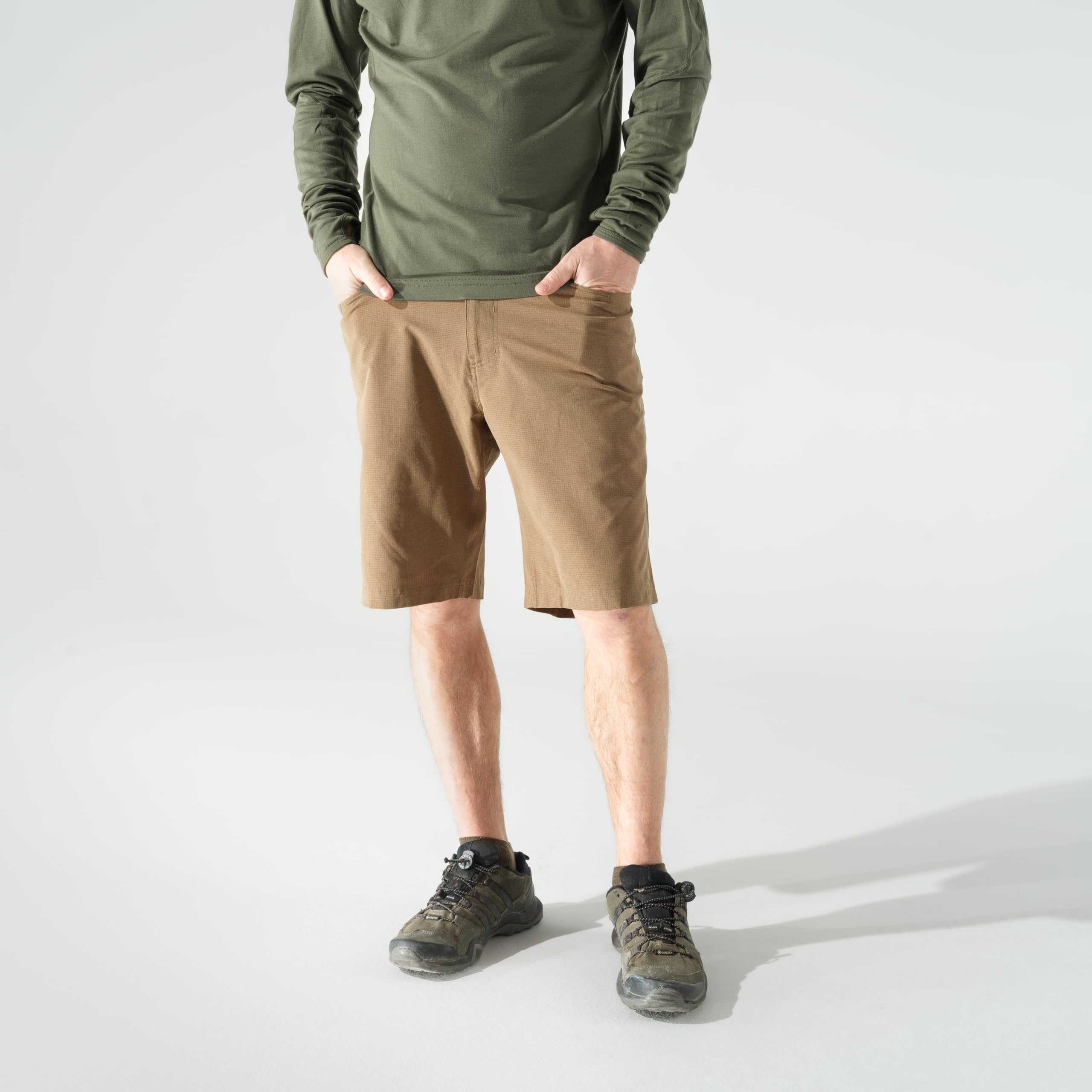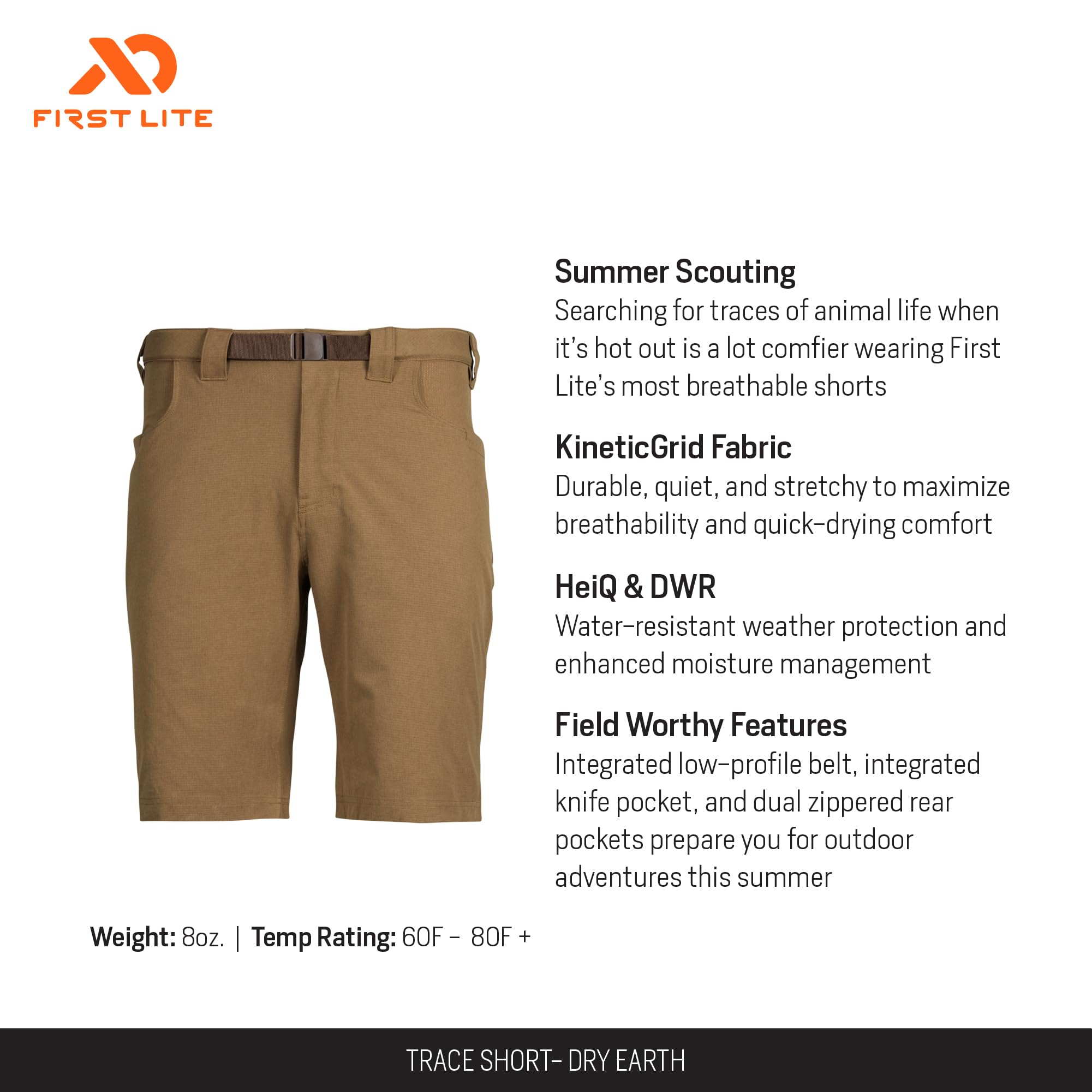 Engineered for those who thrive in the outdoors, the First Lite Men's Trace Short in Dry Earth is the ultimate companion for your next adventure. Whether you're trekking rugged trails, exploring the backcountry, or simply enjoying a weekend in the sun, these shorts deliver the performance and comfort you need. The Trace Short is crafted for the active outdoorsman who demands gear that keeps up, offering a blend of rugged durability and lightweight breathability. The quick-drying fabric ensures you stay comfortable and dry, even in unpredictable weather or after a stream crossing. Thoughtfully designed with a classic fit and practical pockets, these shorts provide the freedom of movement and storage you need for a day on the move. The Trace Short is your go-to for reliable comfort and performance, wherever the trail leads.