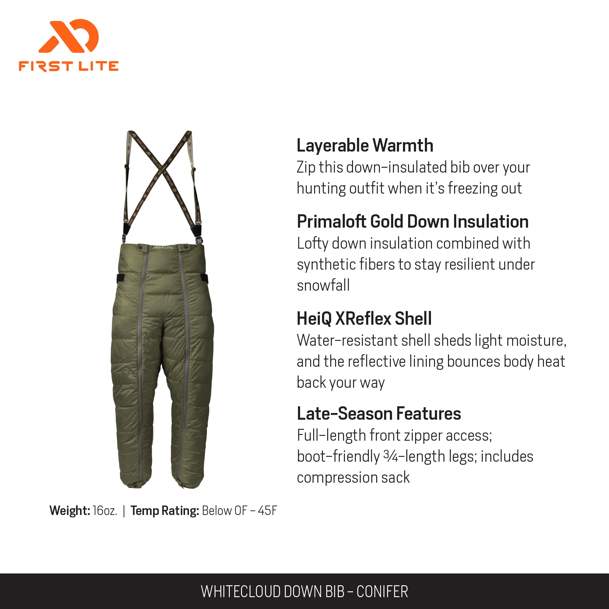 Engineered for those who demand reliable warmth in the harshest conditions, the First Lite Men's Whitecloud Down Bib in Conifer is the ultimate companion for cold-weather pursuits. Crafted for the dedicated outdoorsman, this bib harnesses the power of Whitecloud down fill, delivering exceptional insulation without the bulk, so you stay agile and comfortable. The bib design ensures extended coverage, shielding you from biting winds and snow, while the Conifer green color blends seamlessly into forested landscapes for a refined, outdoors-ready look. Whether you're glassing a ridgeline, setting up camp, or braving a winter hunt, this bib is built to keep you warm, protected, and focused on the adventure ahead.