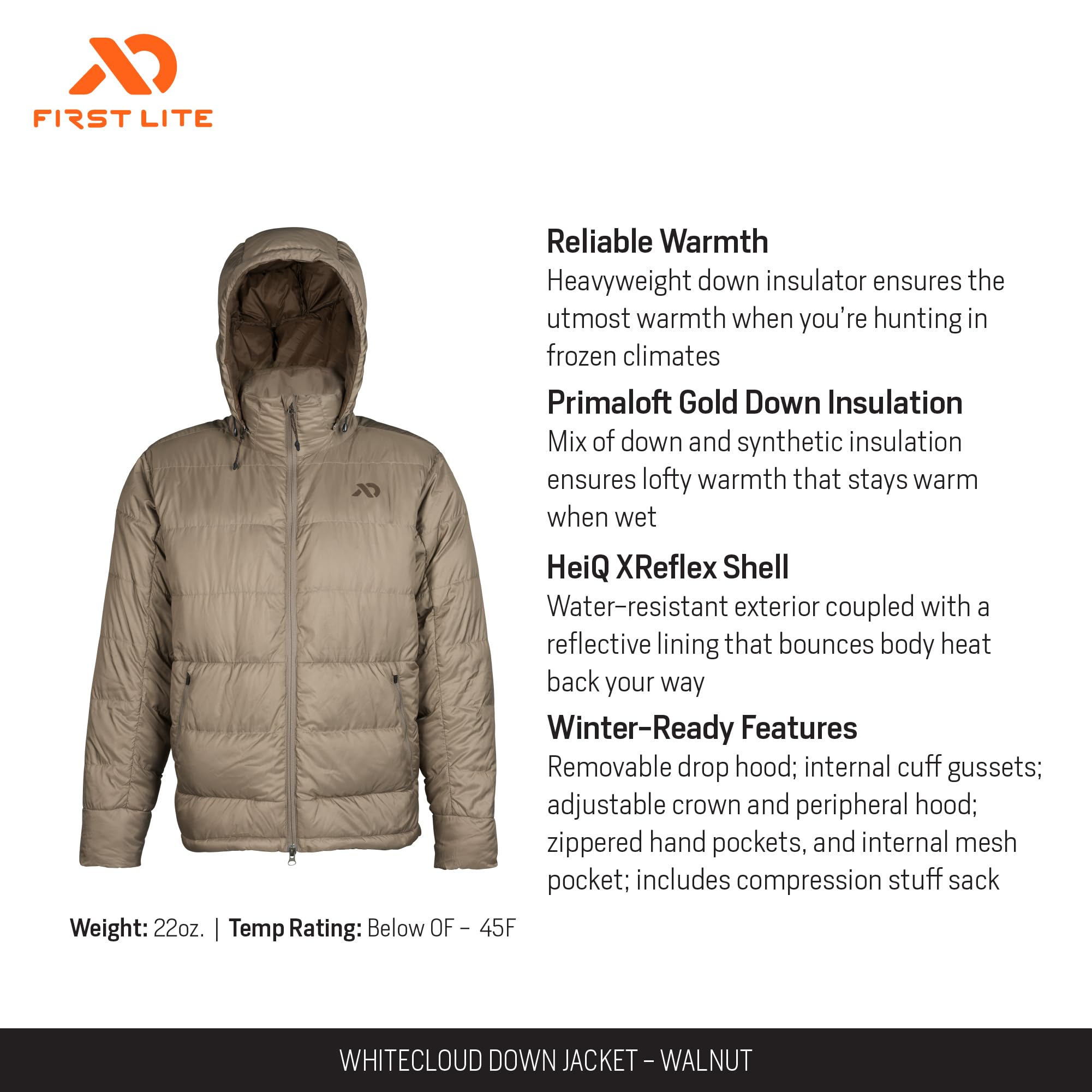 Engineered for those who demand both performance and style, the First Lite Men's Whitecloud Down Jacket in Walnut is the ultimate companion for braving the cold. Designed for the modern outdoorsman, this jacket combines advanced insulation technology with a sleek, versatile look. The Whitecloud insulation delivers exceptional warmth without the bulk, ensuring you stay agile and comfortable whether you're trekking through the backcountry, setting up camp, or navigating the urban chill. The Walnut color offers a refined, earthy tone that transitions seamlessly from the trail to the town. Built with a rugged outer shell, this jacket stands up to biting winds and frigid temperatures, making it a reliable choice for any cold-weather adventure. Experience the perfect blend of lightweight warmth, durability, and style with a jacket that's ready for any challenge the outdoors throws your way.