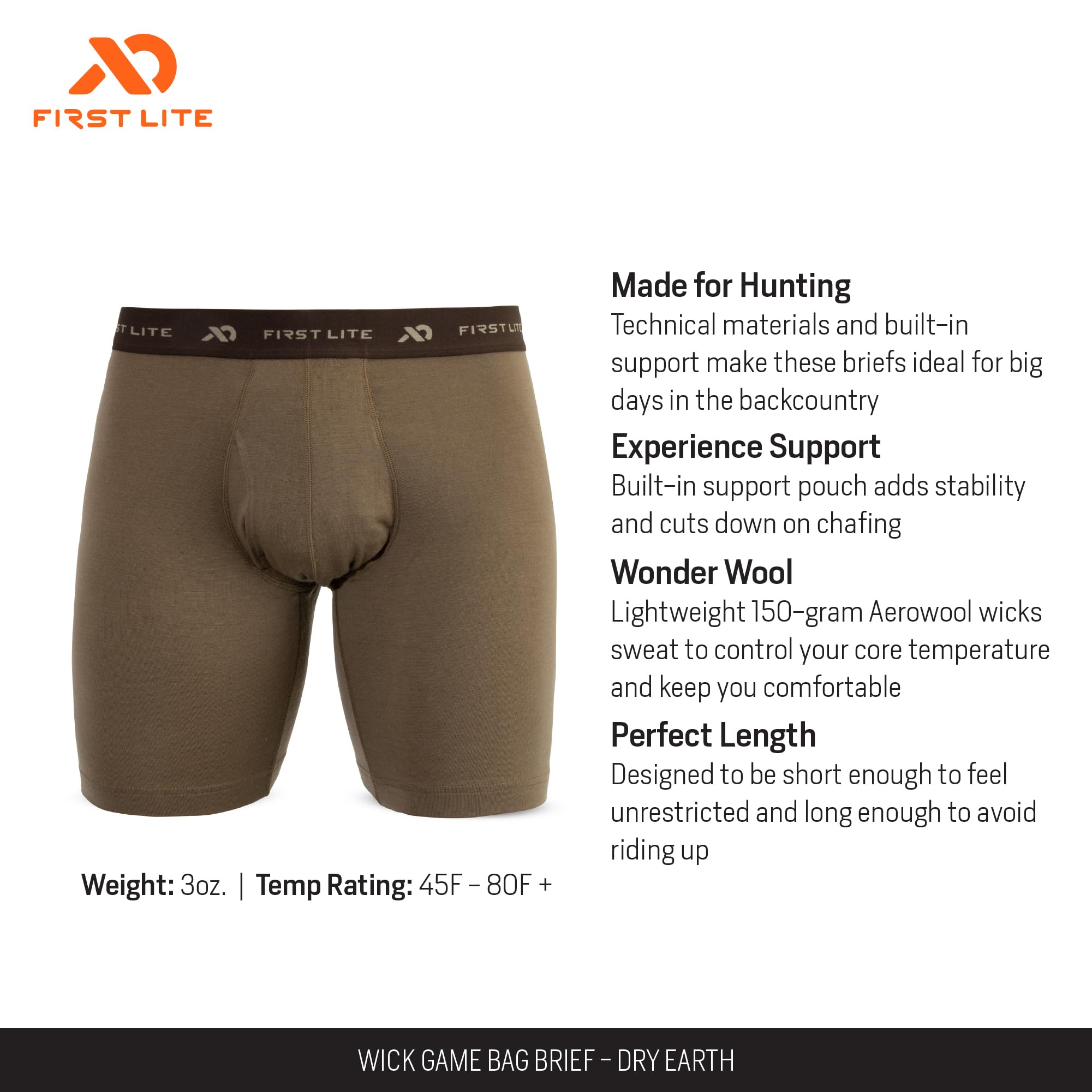 Designed for the dedicated hunter, the First Lite Men's Wick Game Bag Brief in Dry Earth delivers the perfect blend of functionality, comfort, and stealth for your next pursuit. Crafted for those who demand efficiency in the field, this game bag brief features advanced moisture-wicking technology, ensuring you stay dry and comfortable during long treks and challenging hunts. The Dry Earth color seamlessly blends into natural surroundings, providing the camouflage you need for stealthy movement. Its spacious main compartment is engineered to carry your game and essential gear, while the lightweight, durable construction guarantees comfort and resilience for all-day wear. Whether you're navigating dense brush or open terrain, this game bag brief is your reliable companion for organized, hassle-free hunting.