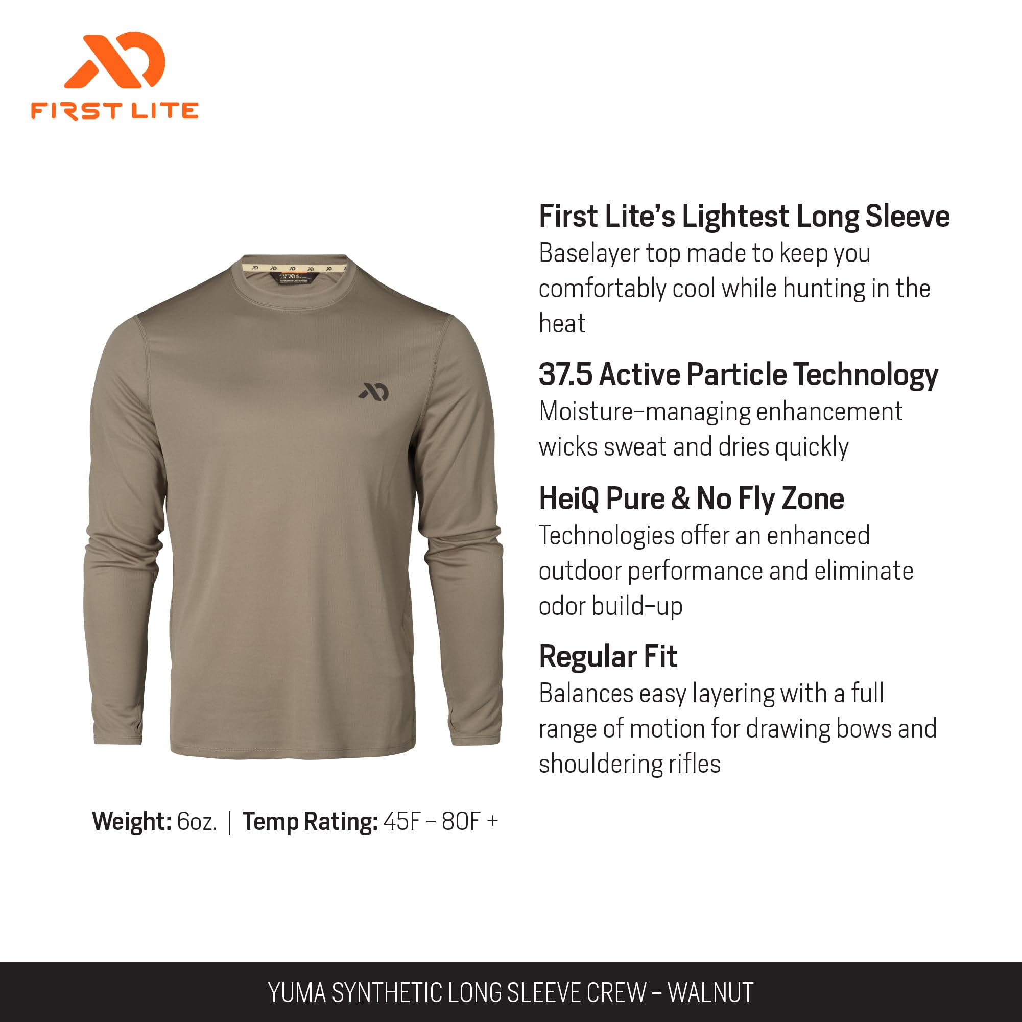 Engineered for the demands of the outdoors, the First Lite Men's Yuma Synthetic Long Sleeve Crew in Walnut is the ultimate companion for active pursuits in changing conditions. Its advanced synthetic construction is designed to keep you dry and comfortable, efficiently wicking away sweat and drying rapidly, so you stay focused on the adventure ahead. The Walnut color blends seamlessly with natural surroundings, making it a subtle and stylish choice for the field, the trail, or the campsite. Whether you're layering up for a chilly morning or wearing it solo on a brisk hike, the Yuma Crew delivers the durability and comfort you need for long days outdoors. Its versatile design ensures it transitions effortlessly from base layer to standalone shirt, making it a staple for any outdoor enthusiast's wardrobe.