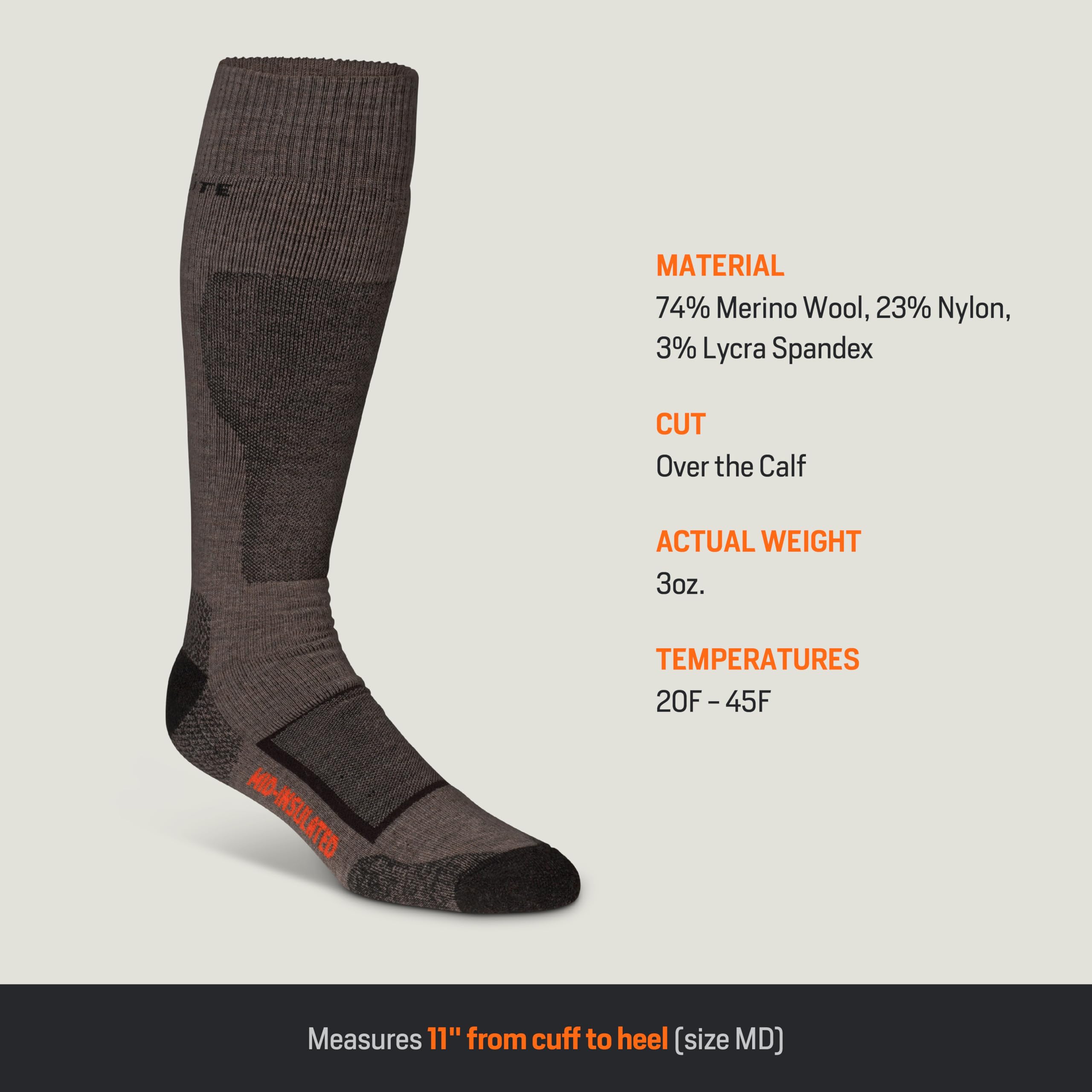 Experience unmatched comfort and performance with the First Lite Mid Season Merino OTC Sock. Crafted for the demands of the outdoors, this over-the-calf sock is the perfect companion for hunters, hikers, and anyone who values warmth and durability. The premium merino wool construction naturally regulates temperature, keeping your feet cozy without overheating, while the over-the-calf design offers extra coverage and support. The walnut color is both practical and stylish, blending seamlessly with your outdoor and casual wardrobe. Whether you're trekking through the woods or spending long hours on your feet, this sock is engineered to keep you dry, comfortable, and focused on your adventure. The various sizing options ensure a secure, comfortable fit, while the robust construction stands up to the rigors of repeated use in a variety of conditions.