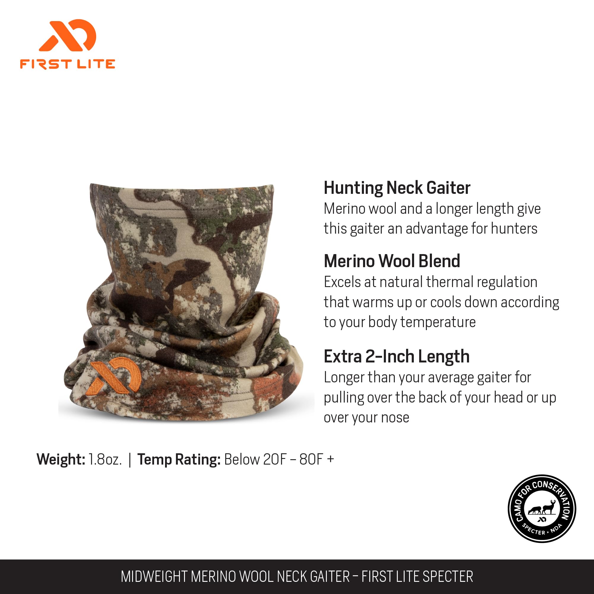 Stay comfortable and protected in any season with the First Lite Midweight Neck Gaiter in Specter OS. Designed for the outdoors enthusiast who demands both performance and style, this gaiter offers the perfect balance of warmth and breathability. Its advanced fabric technology ensures moisture is quickly wicked away, keeping you dry and comfortable whether you're hiking, hunting, or braving the morning chill. The Specter OS colorway delivers a modern, understated look that blends seamlessly with a variety of outdoor apparel. Lightweight and compact, this gaiter is easy to stow in a pocket or pack, making it a reliable companion for any adventure. Experience the difference of a gaiter that's built for versatility, comfort, and style.