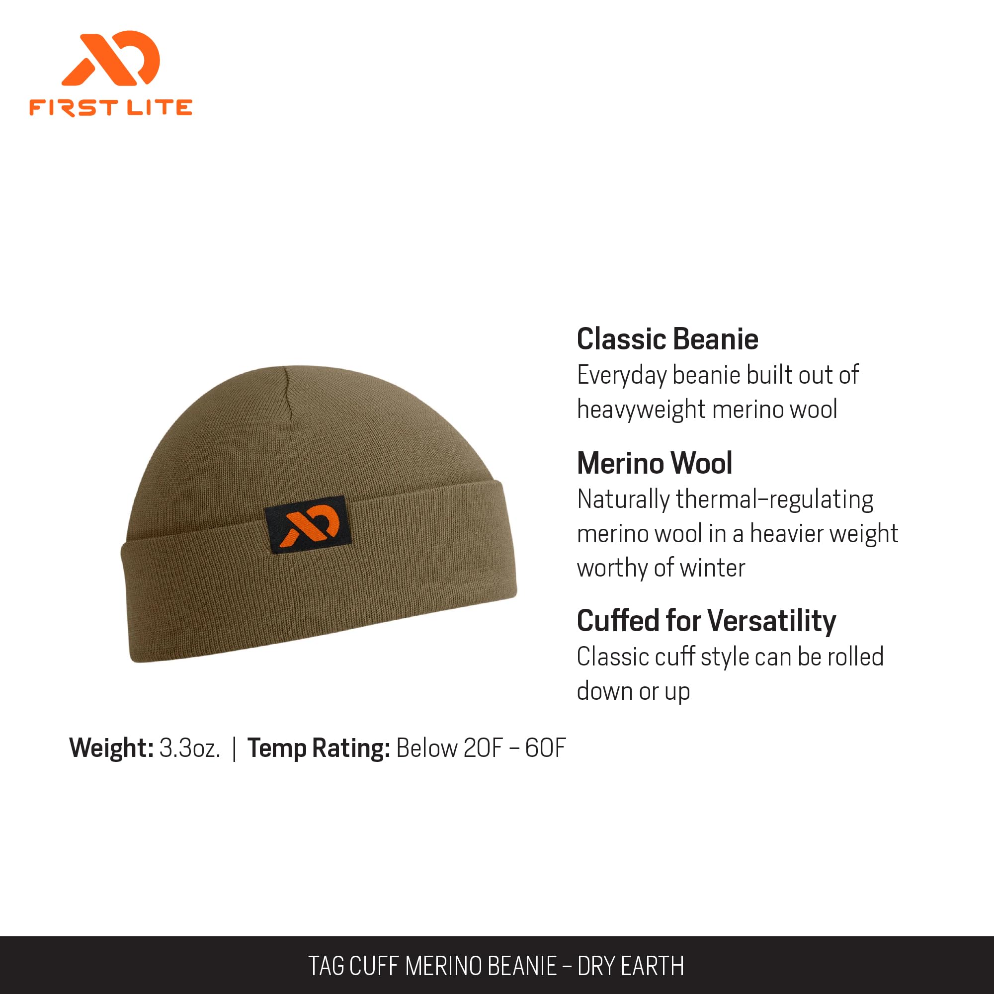 Experience unmatched warmth and comfort with the First Lite Tag Cuff Merino Beanie, crafted for those who demand performance and style in the outdoors. Made from premium merino wool, this beanie naturally regulates temperature and wicks moisture, ensuring you stay cozy and dry in any condition. The thoughtfully designed tag cuff not only elevates the beanie's look but also adds a functional edge, making it a reliable companion for brisk mornings, mountain hikes, or everyday errands. The Dry Earth color blends seamlessly with any wardrobe, offering a subtle, earthy tone that's as versatile as it is timeless. Designed with a universal fit, this beanie adapts to most head sizes, providing a secure and comfortable feel for all-day wear. Whether you're hitting the trail or heading into town, the Tag Cuff Merino Beanie is the perfect blend of performance, style, and comfort.