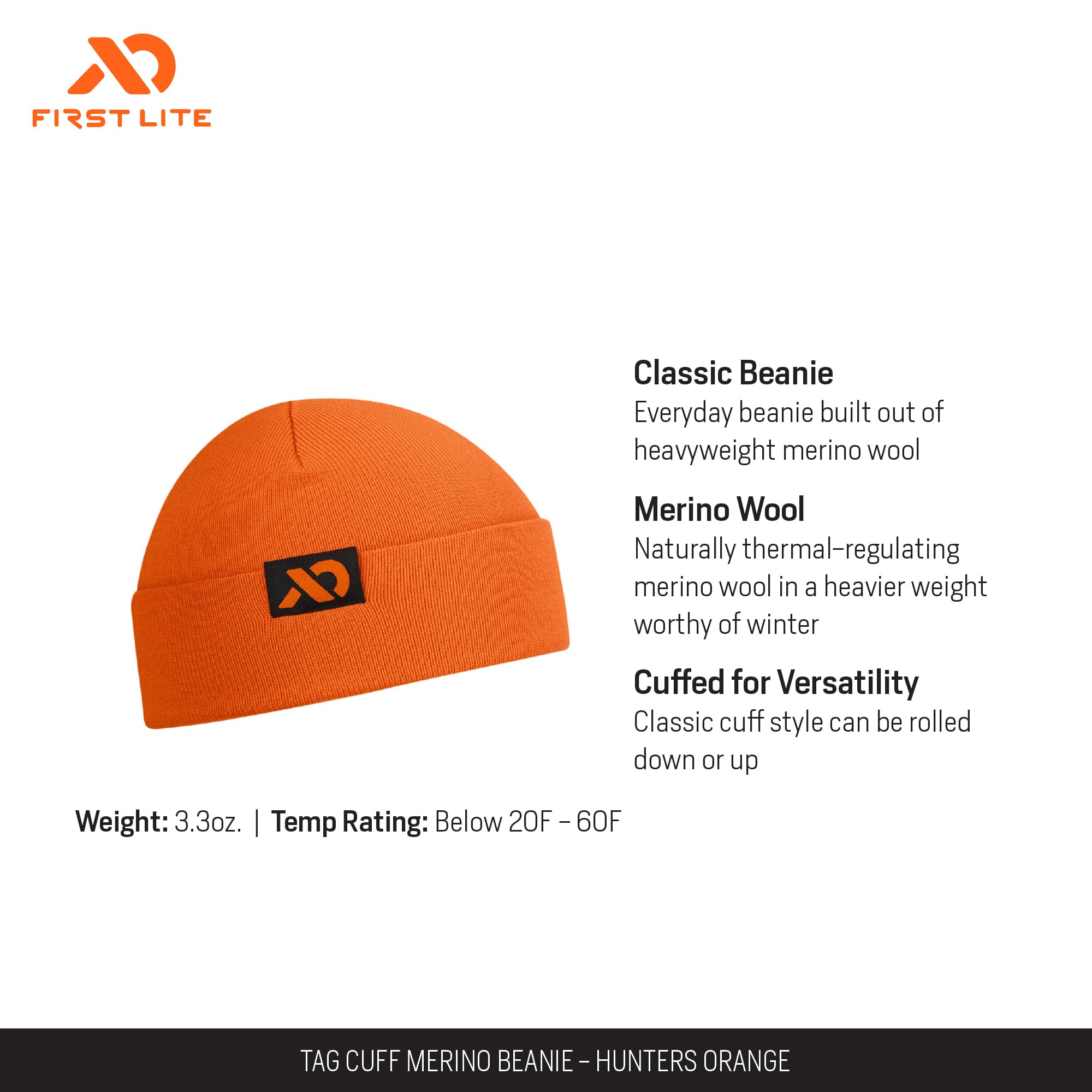 Stay warm and visible during your outdoor pursuits with the First Lite Tag Cuff Merino Beanie. Crafted with the adventurer in mind, this beanie combines the natural insulating power of Merino wool with a bold, high-visibility Hunters Orange color, making it a smart choice for hunters, hikers, and anyone braving the cold. The beanie's tag cuff design not only adds a touch of style, but also ensures a secure and comfortable fit, while the one-size-fits-all construction means it's ready for anyone in your crew. Whether you're glassing a ridgeline, setting up camp, or just enjoying a brisk morning, this beanie delivers the warmth, comfort, and safety you need in the field.