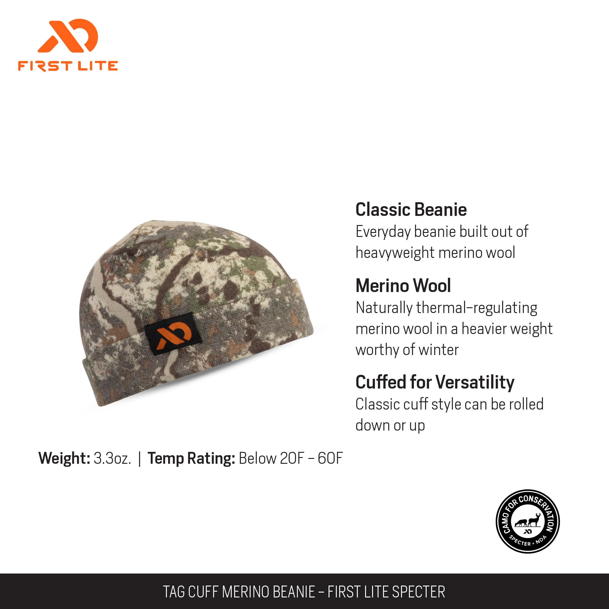 Experience unmatched warmth and modern style with the First Lite Tag Cuff Merino Beanie in the versatile Specter colorway. Crafted from premium merino wool, this beanie delivers exceptional insulation and breathability, ensuring you stay comfortable in fluctuating temperatures. The thoughtfully designed tag cuff not only elevates the beanie's look, but also adds a functional edge, making it a standout accessory for any adventure. Whether you're heading into the backcountry, hitting the trail, or navigating the city, this beanie's one-size-fits-most construction guarantees a secure and comfortable fit for all-day wear. The Specter colorway's subtle, modern aesthetic seamlessly complements any outdoor or casual ensemble, making this beanie a reliable and stylish choice for any occasion.