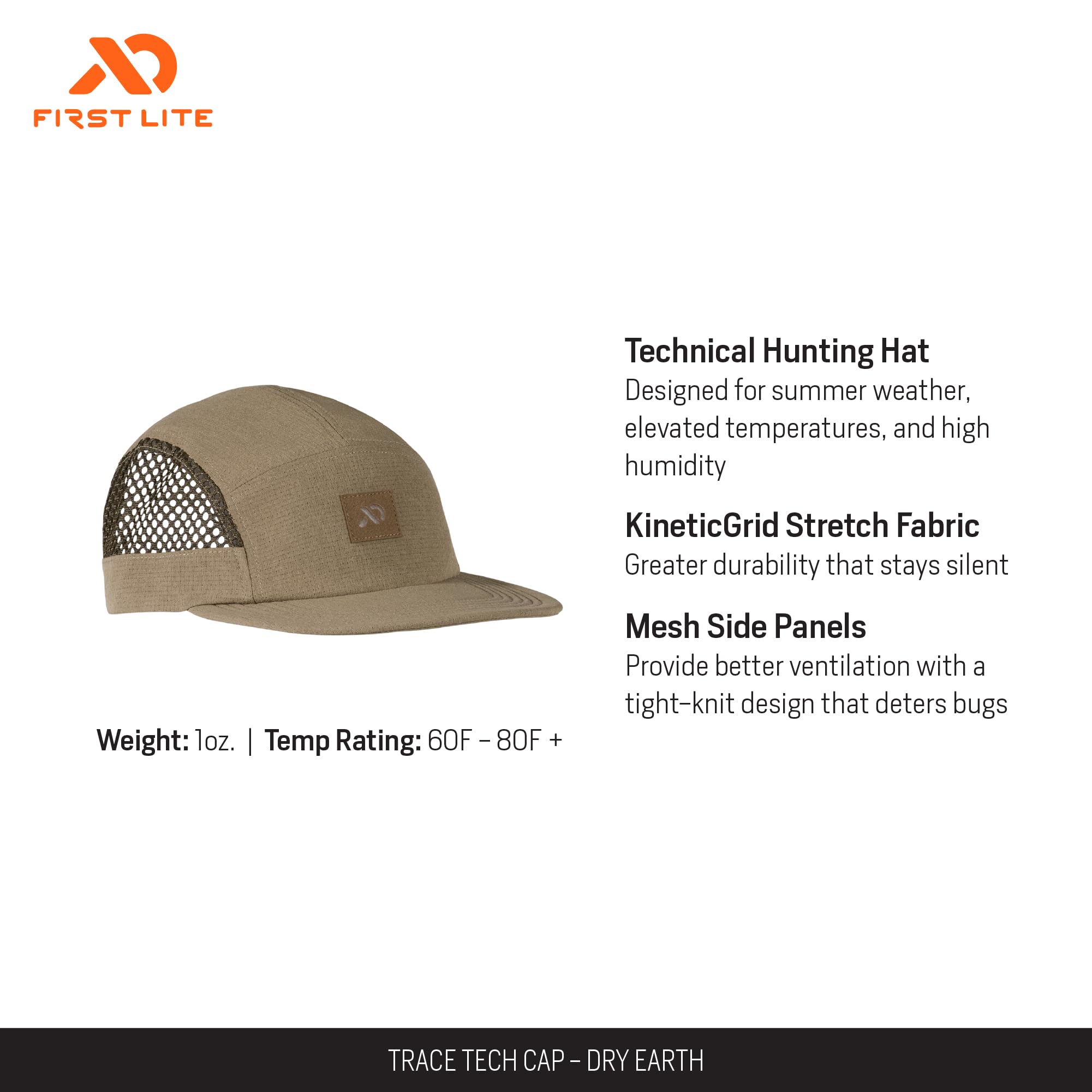 Experience unmatched comfort and performance with the First Lite Trace Tech Cap in Dry Earth. Designed for the active outdoorsman, this cap combines advanced fabric technology with a sleek, versatile look. Whether you're hiking, hunting, or simply enjoying a day in the sun, the Trace Tech Cap keeps you cool and dry, thanks to its superior moisture management and quick-drying capabilities. The adjustable closure ensures a secure, personalized fit, while the cap's lightweight construction makes it a go-to choice for all-day wear. Built to withstand the rigors of the outdoors, this cap is as durable as it is comfortable, making it a reliable companion for any adventure.