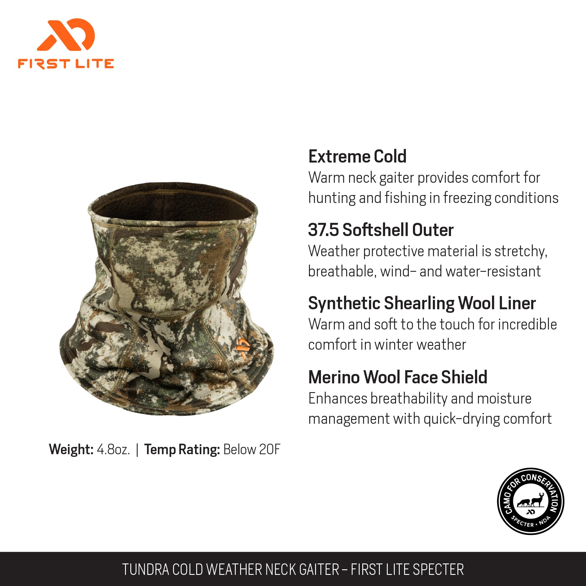 Stay protected and concealed in the harshest conditions with the First Lite Tundra Neck Gaiter in the exclusive Specter pattern. Designed for the dedicated outdoorsman, this gaiter delivers reliable warmth and coverage, whether you're glassing for game, hiking in the backcountry, or braving the early morning chill. The soft, breathable fabric ensures you remain comfortable and focused, while the moisture-wicking properties keep you dry and insulated. The Specter camouflage pattern blends seamlessly with natural surroundings, giving you the edge in the field. With a lightweight, one-size-fits-all design, this gaiter offers a secure, comfortable fit for all-day wear, making it a must-have for any cold-weather adventure.