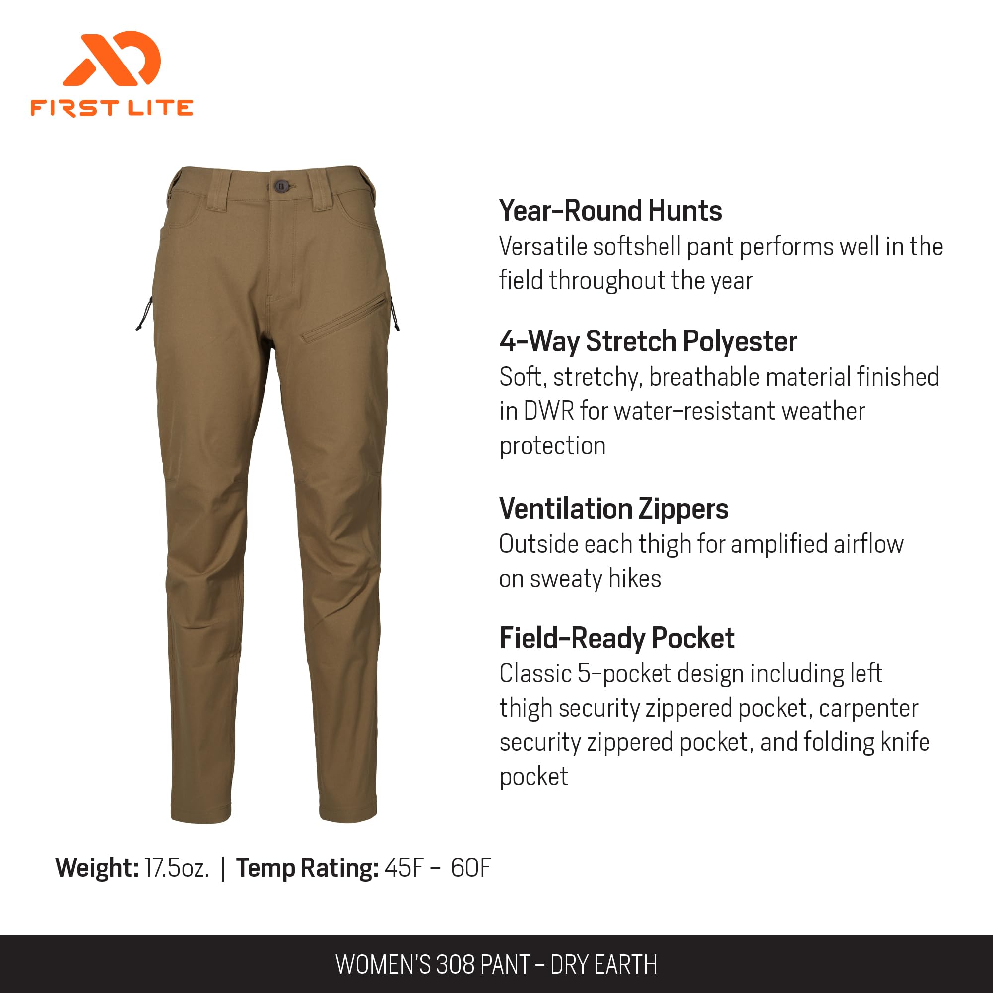 Engineered for women who demand performance and versatility from their outdoor gear, the First Lite Women's 308 Pant in Dry Earth is the ultimate companion for your next adventure. Whether you're trekking rugged trails, stalking game, or simply enjoying the great outdoors, these pants deliver the durability and comfort you need. The tailored fit and flexible material move with you, ensuring unrestricted mobility, while the thoughtfully placed pockets keep your essentials close at hand. Built to withstand the elements and the demands of the wild, these pants are your go-to for every outdoor pursuit, from the backcountry to your backyard.