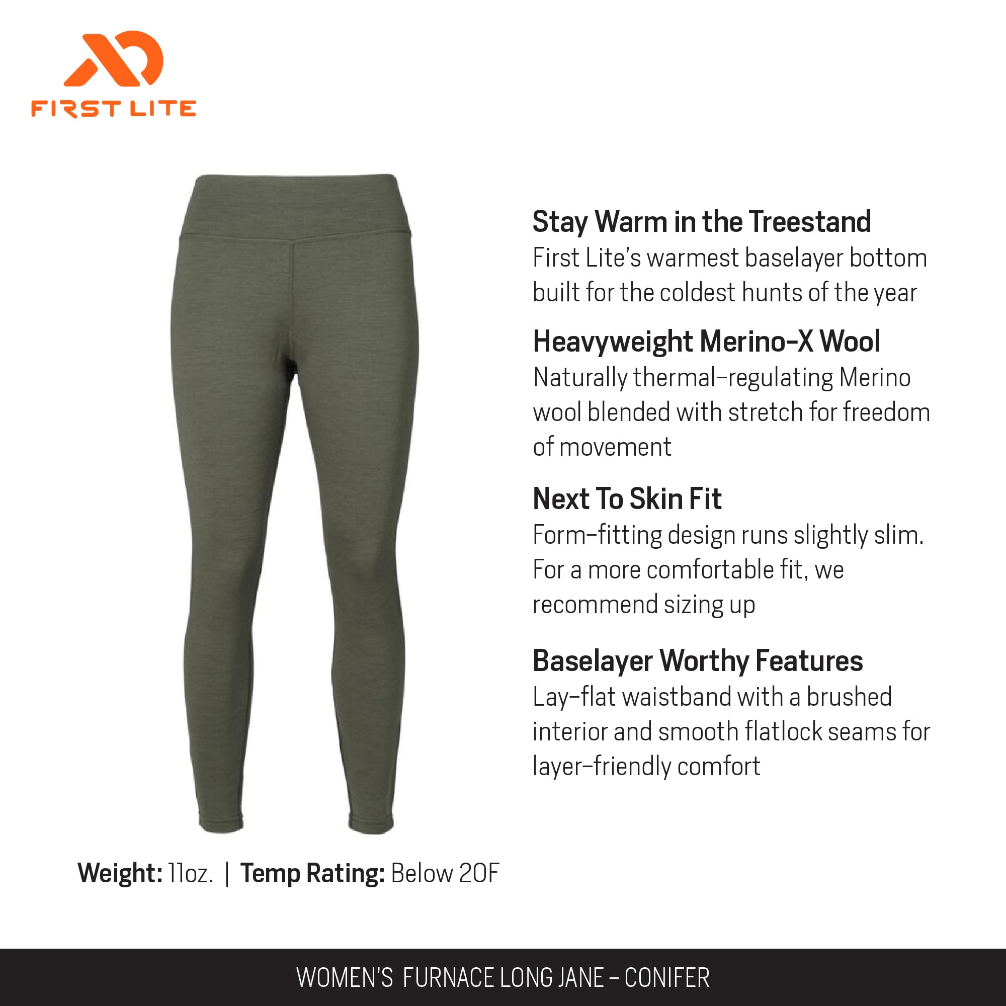 Stay warm and comfortable through the coldest days with the First Lite Women's Furnace Long Jane 2.0 Pant. Designed for the modern outdoorswoman, these long johns blend technical performance with a flattering, natural look. The conifer green color evokes the tranquility of the forest, while the advanced fabric ensures you stay dry and cozy, whether you're hiking, skiing, or simply braving a chilly morning. The Furnace Long Jane 2.0 Pant moves with you, offering a snug, stretchy fit that never restricts, making it the perfect base layer for all your winter adventures or daily cold-weather wear. Experience the difference of a base layer that's as tough and adaptable as you are.