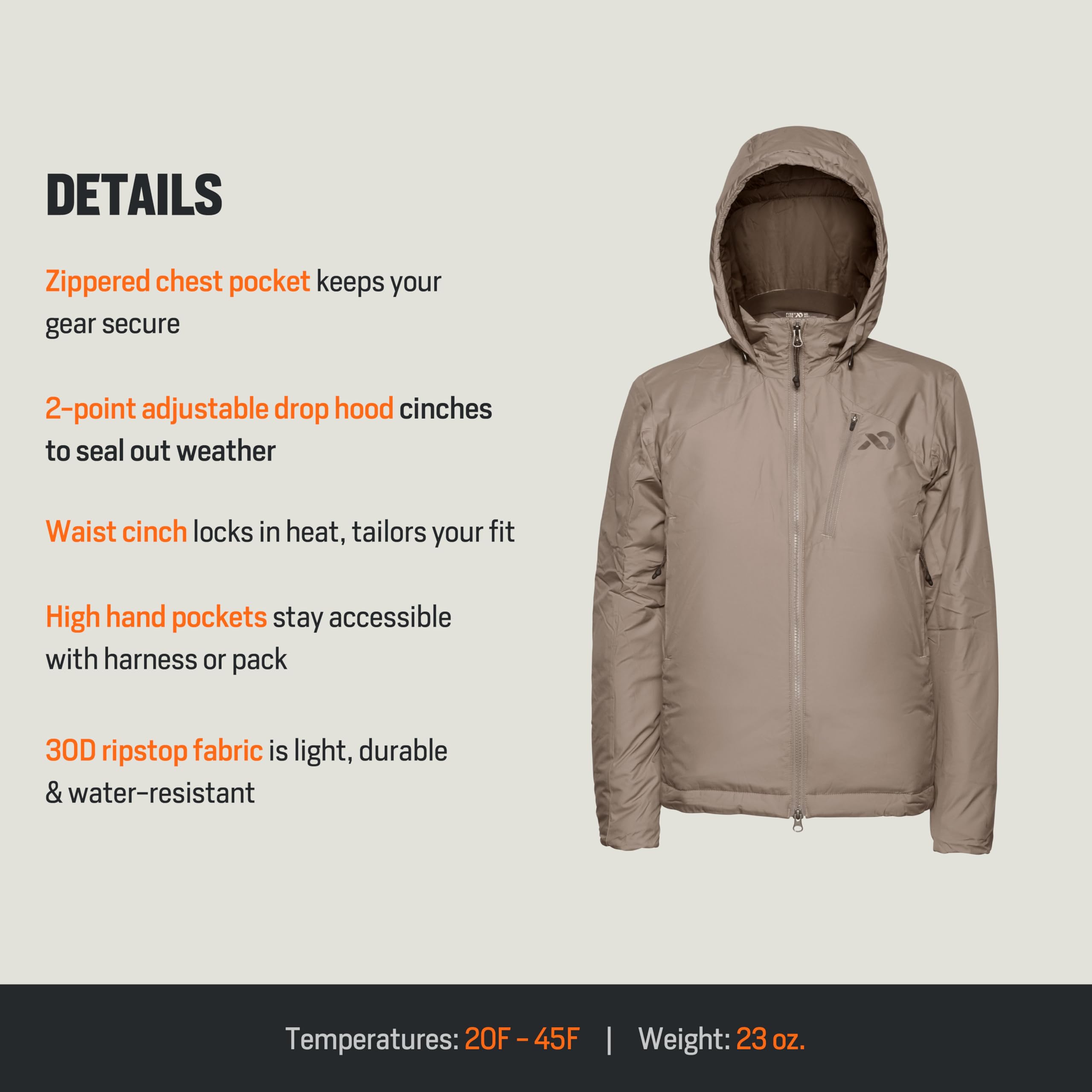 Embrace the chill in style with the First Lite Women's North Range Puffy Jacket. Designed for the adventurous woman who refuses to compromise on warmth or fashion, this jacket delivers reliable insulation in a lightweight, easy-to-pack silhouette. The rich walnut color adds a touch of sophistication, making it a versatile choice for both the trail and the town. Built to withstand the rigors of outdoor pursuits, the North Range Puffy Jacket offers a relaxed, comfortable fit in various sizes, ensuring you stay cozy and unrestricted on every journey. Whether you're layering for a brisk morning hike or seeking a cozy companion for campfire evenings, this jacket is your go-to for warmth, durability, and effortless style.