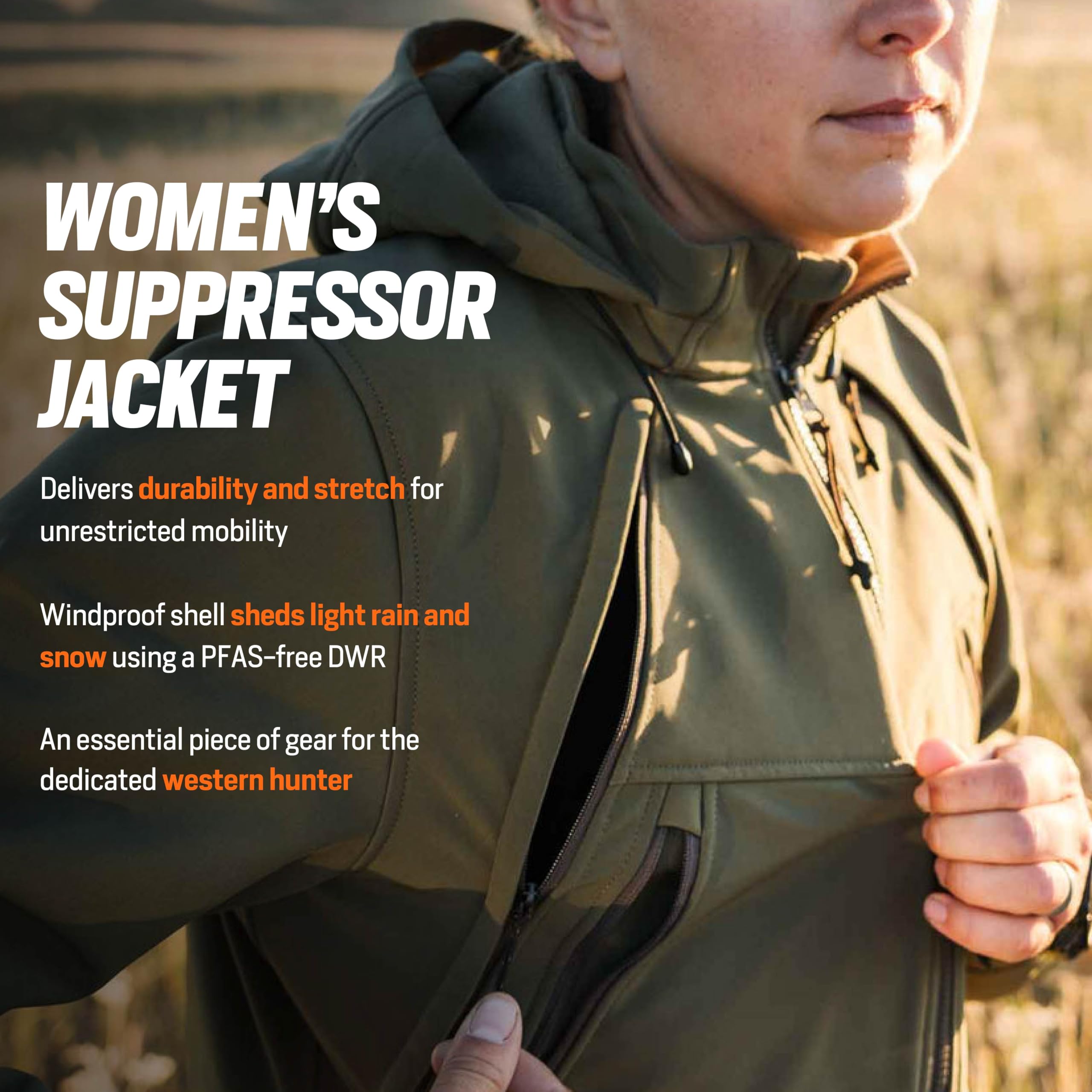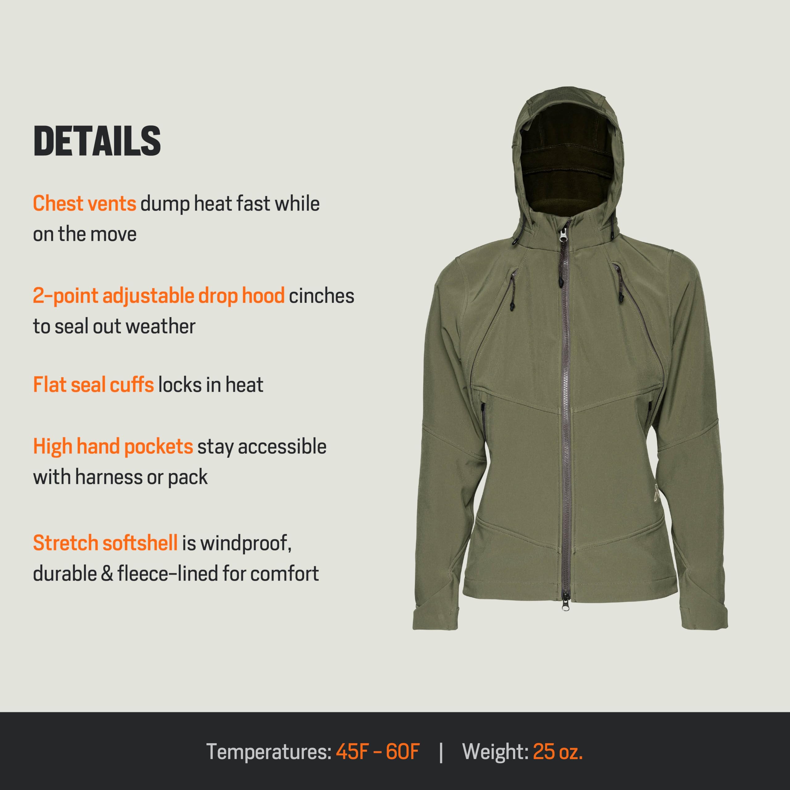 Engineered for women who thrive in the outdoors, the First Lite Women's Suppressor Soft Shell Jacket in Conifer delivers the perfect blend of performance, style, and comfort for your next adventure. Whether you're hiking, hunting, or exploring the backcountry, this jacket is designed to keep you protected and comfortable in changing conditions. The Conifer green hue not only blends seamlessly with natural surroundings for a discreet, stylish look, but also complements a variety of outdoor wardrobes. The jacket's lightweight, breathable construction ensures you stay comfortable during high-output activities, while the water-resistant and windproof materials shield you from the elements. Thoughtful details, like a full front zipper and multiple pockets, keep your essentials secure and your hands free, so you can focus on the journey ahead.