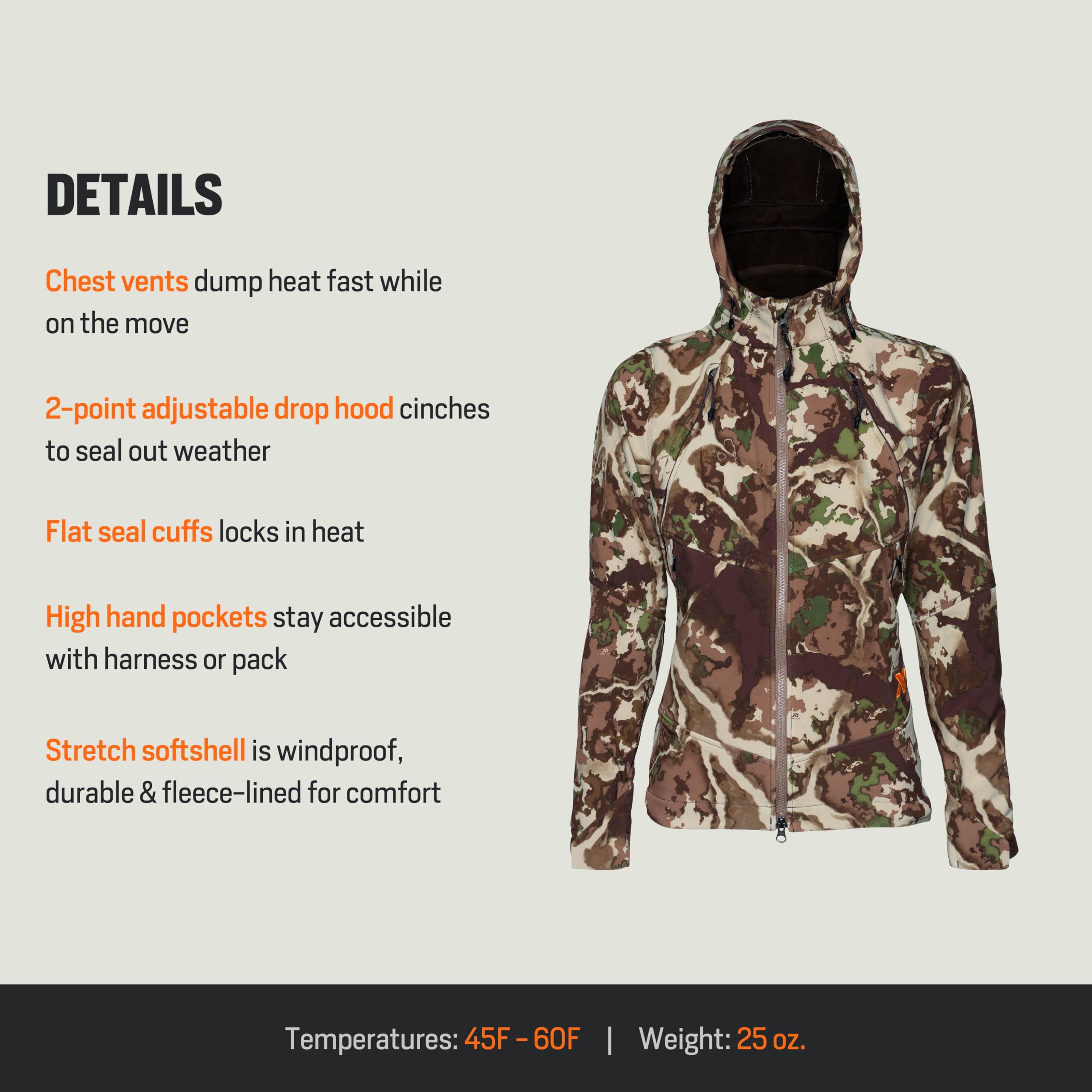 Engineered for the adventurous woman, the First Lite Women's Suppressor Soft Shell Jacket in Fusion delivers the perfect blend of performance, comfort, and style for the outdoors. Whether you're hiking, hunting, or exploring, this jacket adapts to changing conditions, offering reliable protection and a flattering, modern look. The lightweight, breathable construction ensures you stay comfortable during high-output activities, while the water-resistant fabric shields you from unexpected drizzles. Thoughtful, adjustable features allow you to tailor the fit to your body, ensuring unrestricted movement and a personalized feel. The Fusion color design not only stands out for its style, but also for its versatility in the wild, making this jacket a go-to for any outdoor pursuit.