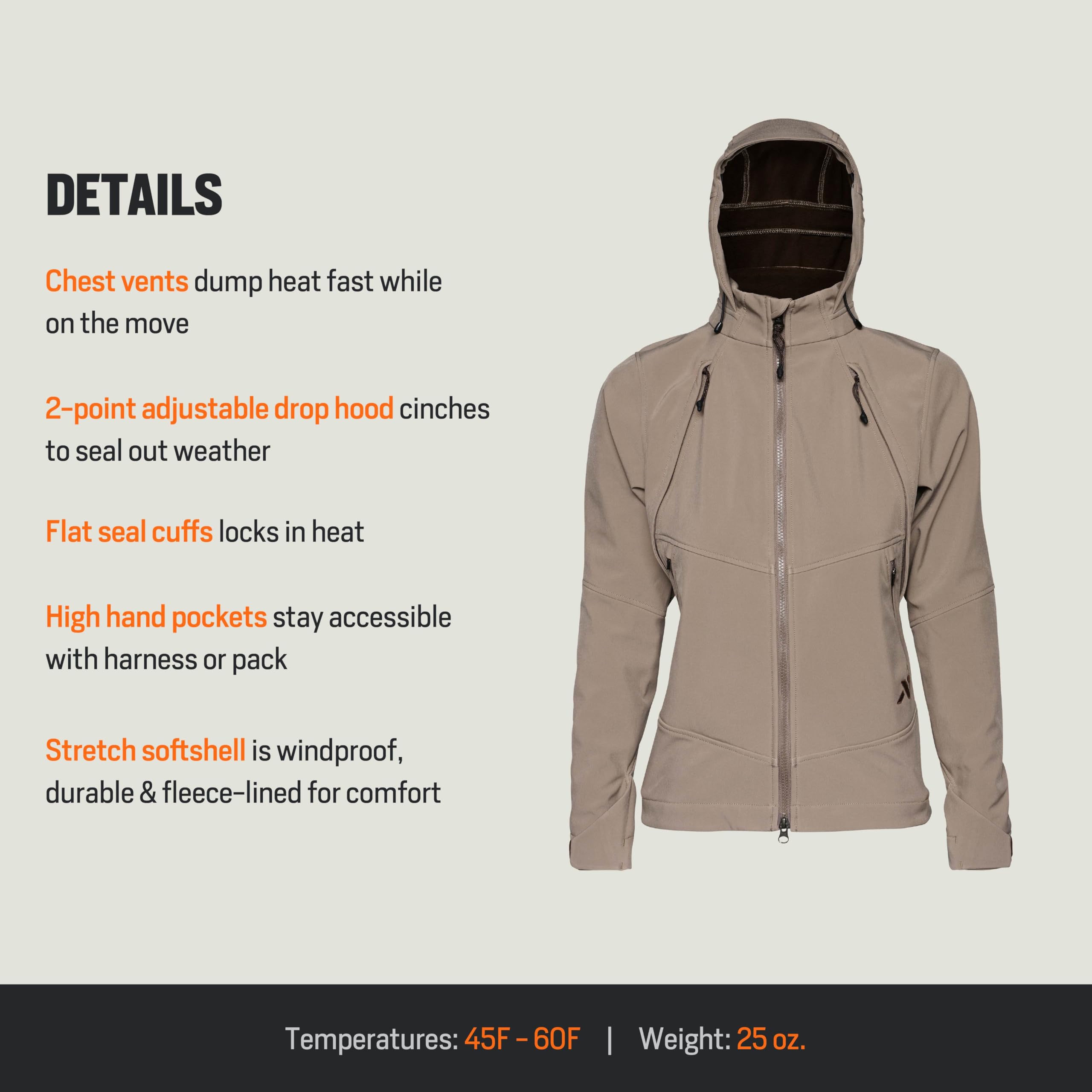 Engineered for women who thrive in the outdoors, the First Lite Women's Suppressor Soft Shell Jacket in Walnut delivers the perfect blend of performance, comfort, and style for your next adventure. Designed to keep you moving in changing conditions, this jacket features a tailored fit, ensuring you have the freedom to layer and the comfort to stay active all day. The Suppressor Soft Shell stands out for its ability to shield you from the elements, thanks to its wind-resistant and water-repellent fabric, while its lightweight and breathable construction means you stay comfortable whether you're hiking, scouting, or enjoying a day in the field. The warm walnut color adds a touch of natural style, making this jacket a versatile staple for any outdoor wardrobe.