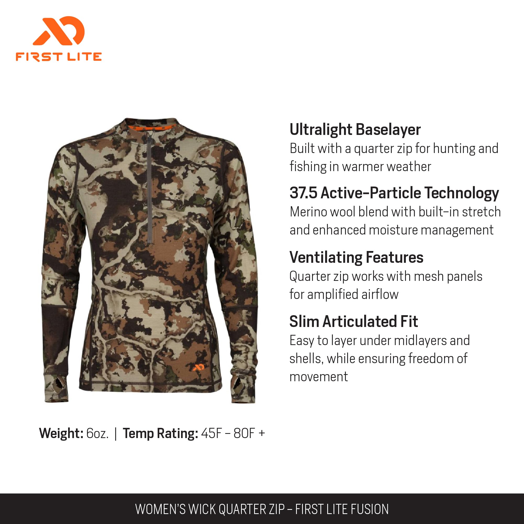 Engineered for women who demand performance and comfort in every adventure, the First Lite Women's Wick Quarter Zip in Fusion is the ultimate layering piece for the outdoors. Its innovative design is tailored for versatility, making it the perfect companion for brisk morning hikes, trail runs, or casual outings. The Wick Quarter Zip is crafted to move with you, offering a relaxed fit for unrestricted mobility. Its advanced fabric blend delivers the perfect balance of warmth and breathability, ensuring you stay comfortable in a range of conditions. Whether you're pushing your limits outdoors or enjoying a laid-back day, this pullover is your go-to for effortless layering and all-day comfort.