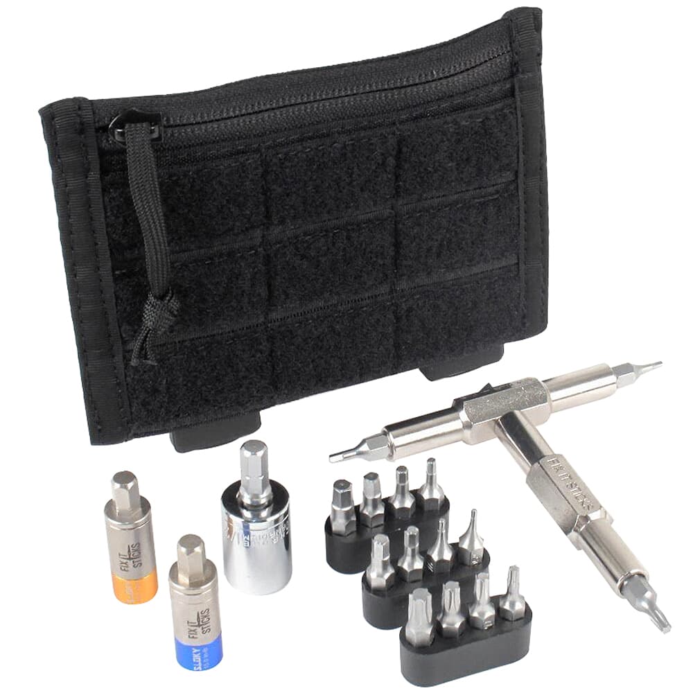 This kit contains a bit adapter, 16 bits, a 1/2 socket, and a 45 inch lbs torque limiter and a 15 inch lbs torque limiter. All of which are kept neatly together in a handy pouch.
