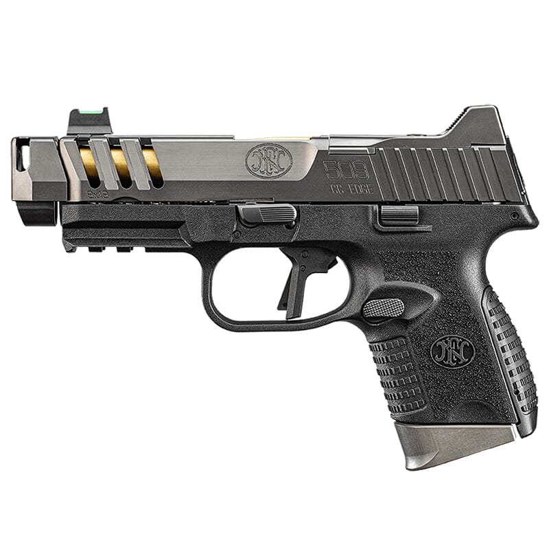 FN sets a new standard for concealed carry pistols with the FN 509 CC Edge! This compact handgun is equipped with a unique, auto-indexing compensator that reduces recoil by an impressive 25% - resulting in faster, more accurate follow up shots. FN 509 CC Edge offers a faster and tool-free takedown when compared to compensated pistols of a similar class, and can be achieved by simply pushing the compensator in and twisting 90° . The FN 509 CC Edge’s included muzzle device is perfectly complimented by the patented Low-Profile Optics Mounting System, which enables the installation of a micro red dot of choice, and places the optic in the perfect positon for co-witnessing with the suppressor-height fiber-optic front sight. Another notable feature of the FN 509 CC Edge includes lightening-cuts in the slide to shave off some weight and make follow-up shots even faster, and a durable PVD and TiN barrel finish adds lubricity.