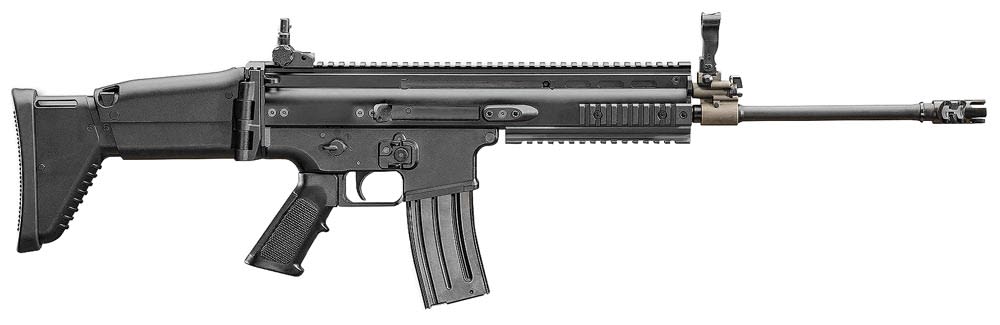 The FN SCAR series of short-stroke, gas piston-operated rifles have the distinction of being the semi-auto version of the very rifles carried by USSOCOM. The SCAR 16S and 17S, chambered in 5.56x45mm and 7.62x51mm, respectively, feature cold hammer-forged, chrome-lined, MIL-SPEC, free-floating barrels. Fully ambidextrous, the controls adapt to any shooter in any shooting position. The polymer stock is telescoping, fully adjustable for length of pull and comb height, and folds to the side for storage. The receiver incorporates a MIL-STD 1913 optical rail. Three rails (at 3-, 6-, and 9-o'clock) mounted forward of the magazine well permit the mounting of accessory optics, lights, and lasers. Both models incorporate a gas regulator, enabling the shooter to adjust gas flow for optimal operation when firing with a suppressor. Both models are available in matte black and FDE.