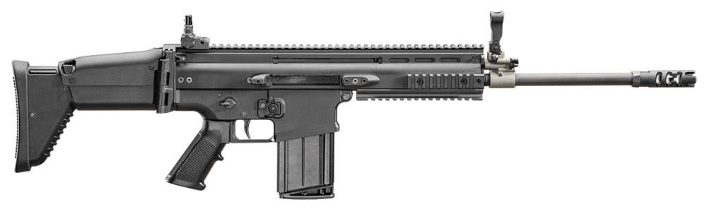 The FN SCAR series of short-stroke, gas piston-operated rifles have the distinction of being the semi-auto version of the very rifles carried by USSOCOM. The SCAR 16S and 17S, chambered in 5.56x45mm and 7.62x51mm, respectively, feature cold hammer-forged, chrome-lined, MIL-SPEC, free-floating barrels. Fully ambidextrous, the controls adapt to any shooter in any shooting position. The polymer stock is telescoping, fully adjustable for length of pull and comb height, and folds to the side for storage. The receiver incorporates a MIL-STD 1913 optical rail. Three rails (at 3-, 6-, and 9-o'clock) mounted forward of the magazine well permit the mounting of accessory optics, lights, and lasers. Both models incorporate a gas regulator, enabling the shooter to adjust gas flow for optimal operation when firing with a suppressor. Both models are available in matte black and FDE.