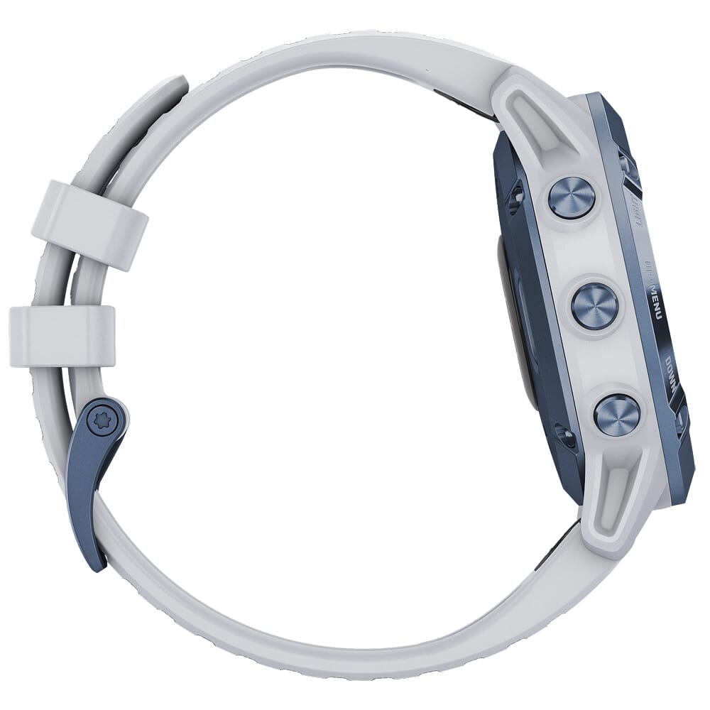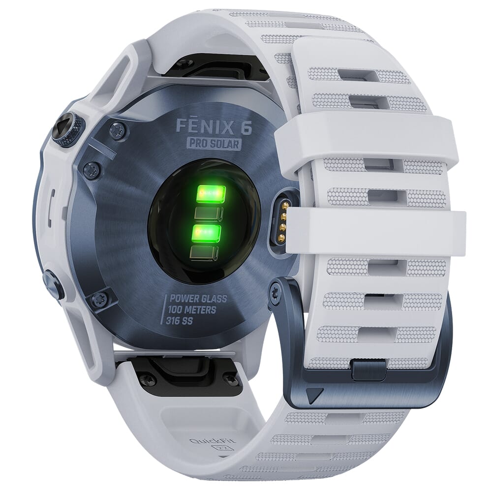 The fenix 6 Pro Solar Smartwatch by Garmin was designed for athletes, adventurers, and other individuals with active outdoor lifestyles. It comes equipped with Multi-GNSS Support, allowing the user to access GPS, GLONASS, and Galileo global navigational satellite systems for more accurate navigational abilities than GPS alone. The fenix 6 Pro Solar also features an advanced set of ABC Sensors which includes an altimeter to display elevation data, a barometer for weather monitoring, and a 3-axis digital compass. Navigational abilities aside, the fenix 6 Pro Solar comes outfitted with a wide array of additional sensors and preloaded apps to get you the most out of your workout and an extra edge in the field. These include Respiration Tracking to monitor your breathing throughout the day and the Pulse OX Sensor, which uses light beams at your wrist to gauge how well your body is absorbing oxygen – good for altitude acclimation and sleep monitoring. Other performance monitoring sensors include the Wrist-Based Heart Rate feature which constantly samples your heart rate and alerts you if it stays too high or too low during periods of rest, and the built in Recovery Time feature that lets you know when you’re ready for another hard workout. The fenix 6 Pro Solar also includes the Body Battery Energy Monitor that takes into account heart rate variability, stress, sleep and other data to help you optimize your body’s energy reserves, and the Hydration Tracking app that keeps track of your daily fluid intake, estimates your body’s sweat loss and sends reminders to keep hydrated.