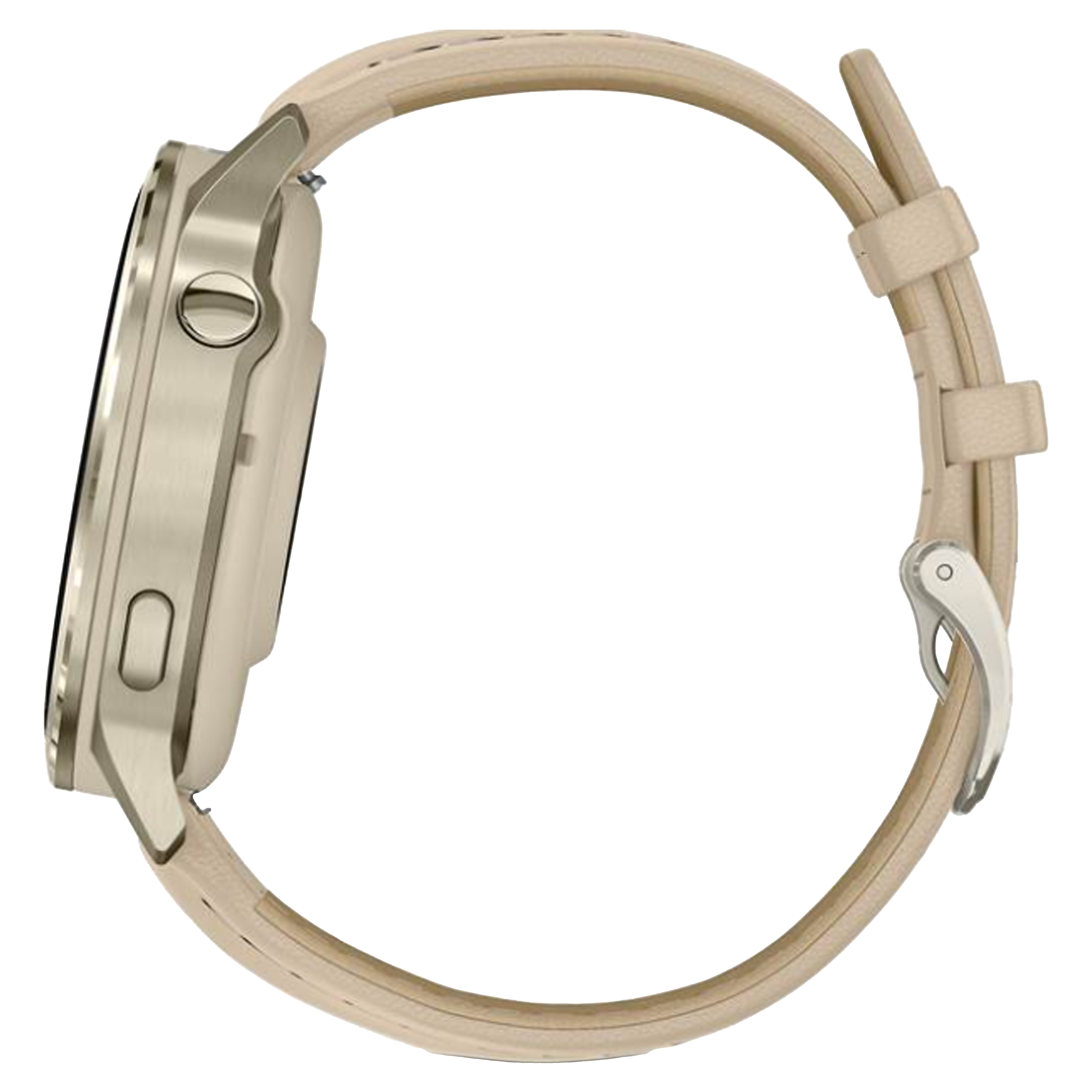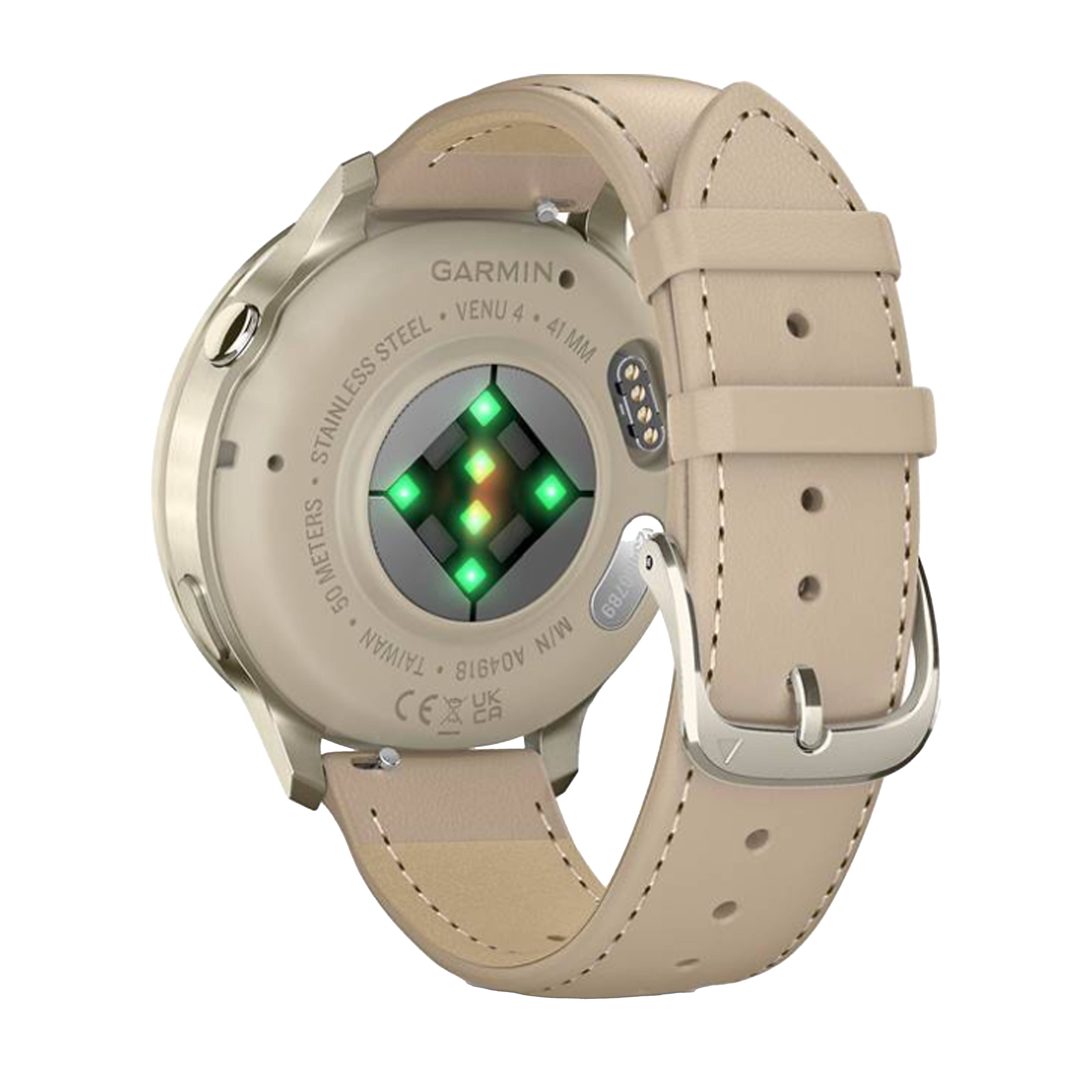 The Garmin Venu 4 41mm in Beige with Lunar Gold and Leather Band is a sophisticated GPS smartwatch designed for comprehensive health and fitness tracking. Featuring a vibrant 1.2" AMOLED display with 390 x 390 pixel resolution, it offers clear visuals and intuitive interaction. The watch includes dual-band GPS, a built-in LED flashlight, and advanced sensors for heart rate, SpO₂, stress, sleep, and more. With up to 10 days of battery life, over 80 preloaded sports apps, Garmin Coach support, and Garmin Pay capabilities. It’s a versatile companion for both everyday wear and rigorous training sessions. The included leather and silicone bands provide style and comfort for any occasion.