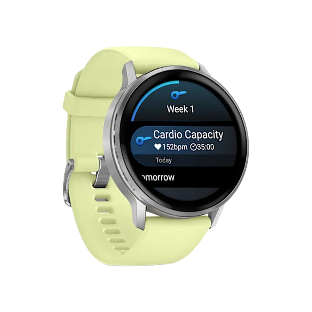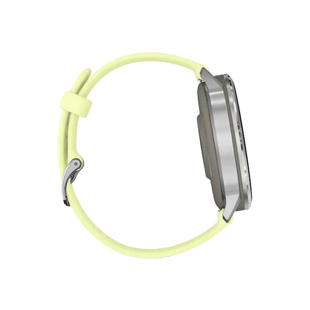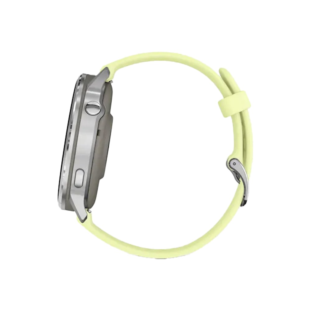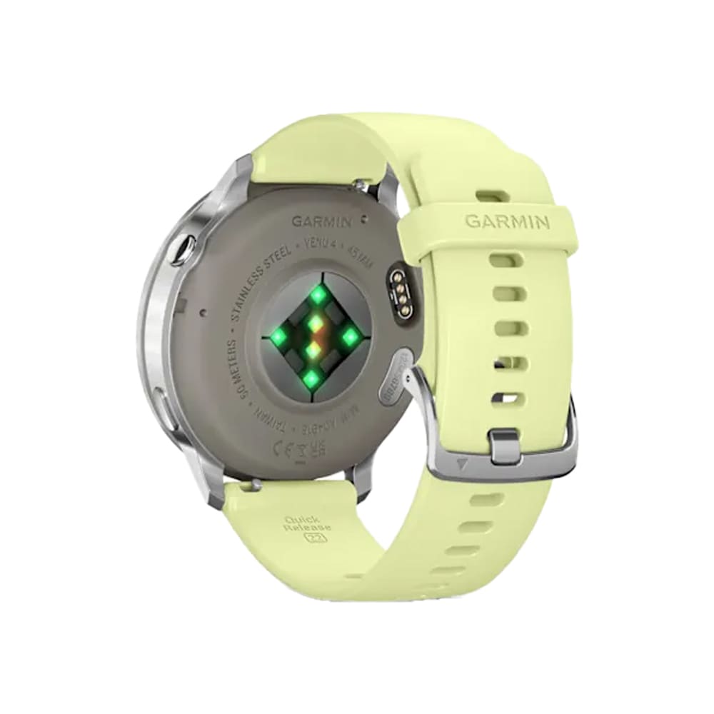 The Garmin Venu 4 (45mm) in Gray with Silver bezel and Citron silicone band is a premium health and fitness smartwatch featuring a vibrant 1.4" AMOLED display with 454 × 454 resolution. It offers advanced health tracking such as heart rate monitoring, ECG, Pulse Ox, sleep, and stress analysis. With over 150 sports modes, GPS, music storage, Garmin Pay, smart notifications, and a built-in LED flashlight, it combines functionality and style. The lightweight yet durable design includes a stainless steel bezel and fiber-reinforced polymer case, perfect for both everyday wear and intense workouts.