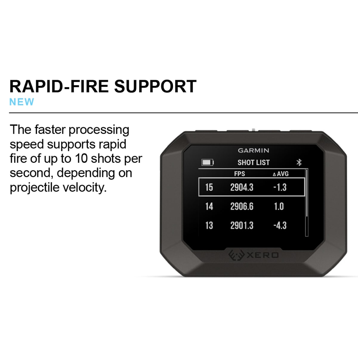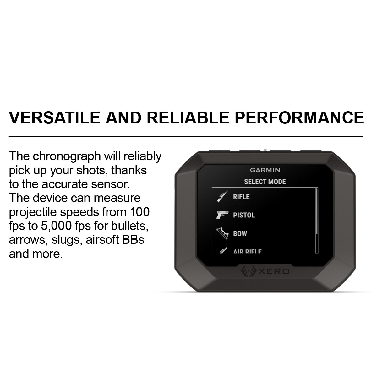 The Garmin Xero® C2 Chronograph delivers uncompromising accuracy for shooters who demand precision. Built with a faster processor and an ultra-reliable sensor, Xero C2 tracks up to 10 shots per second and measures projectile speeds from 100 to 5,000 fps. Whether you’re shooting rifles, pistols, bows, airguns, or airsoft, you’ll receive instant, dependable data to fine-tune every load.