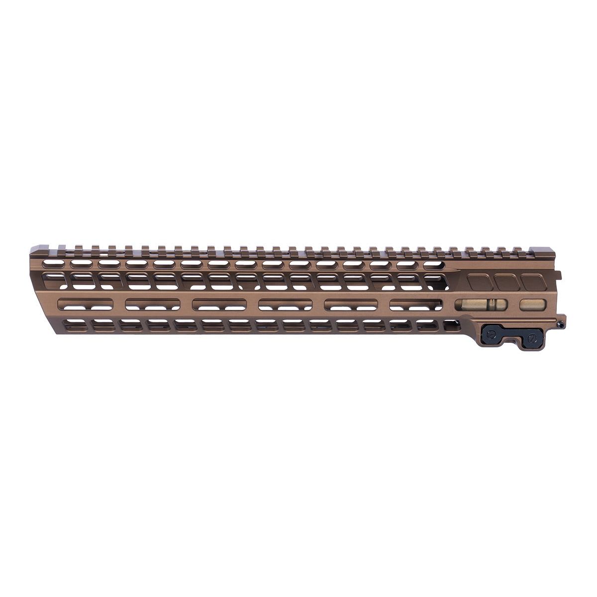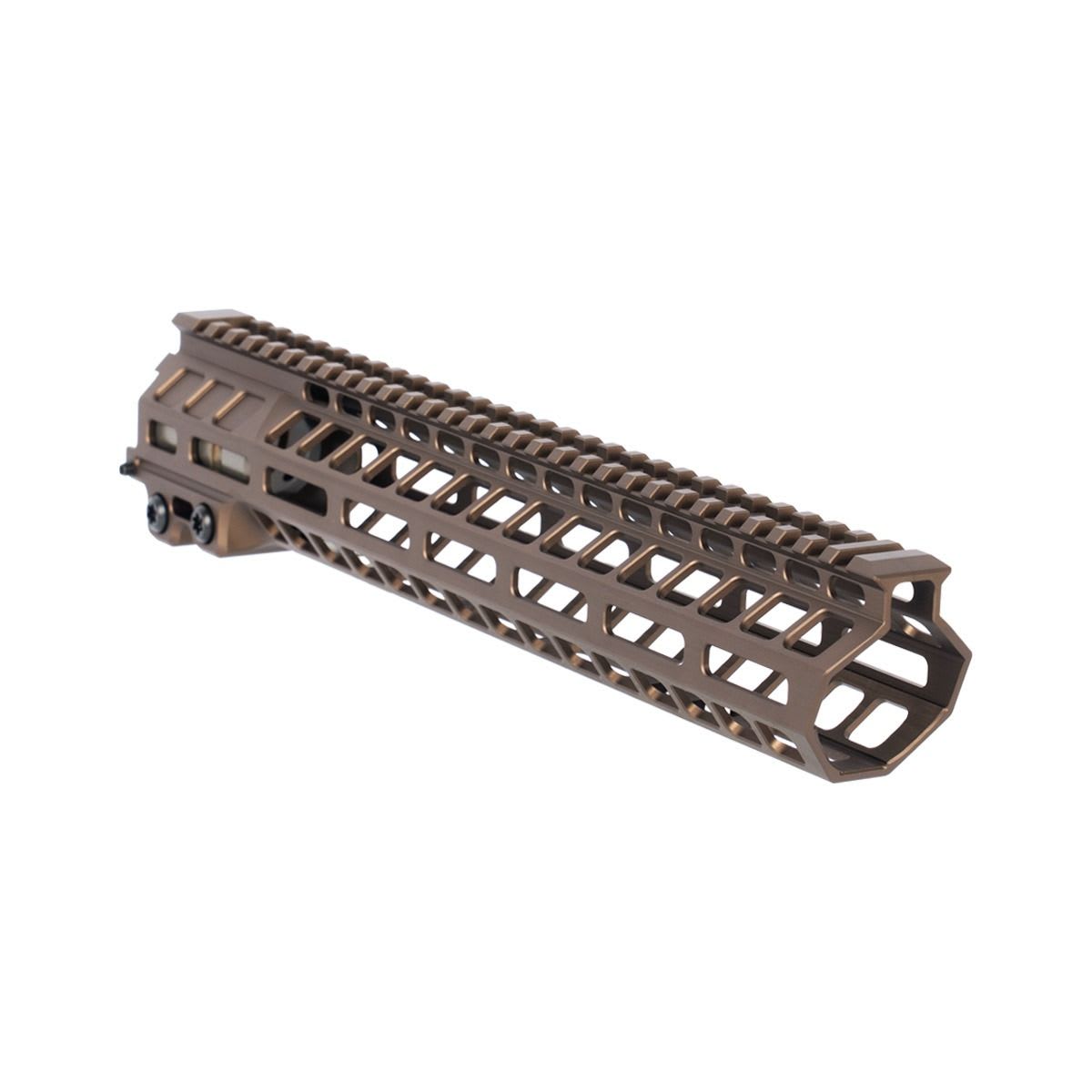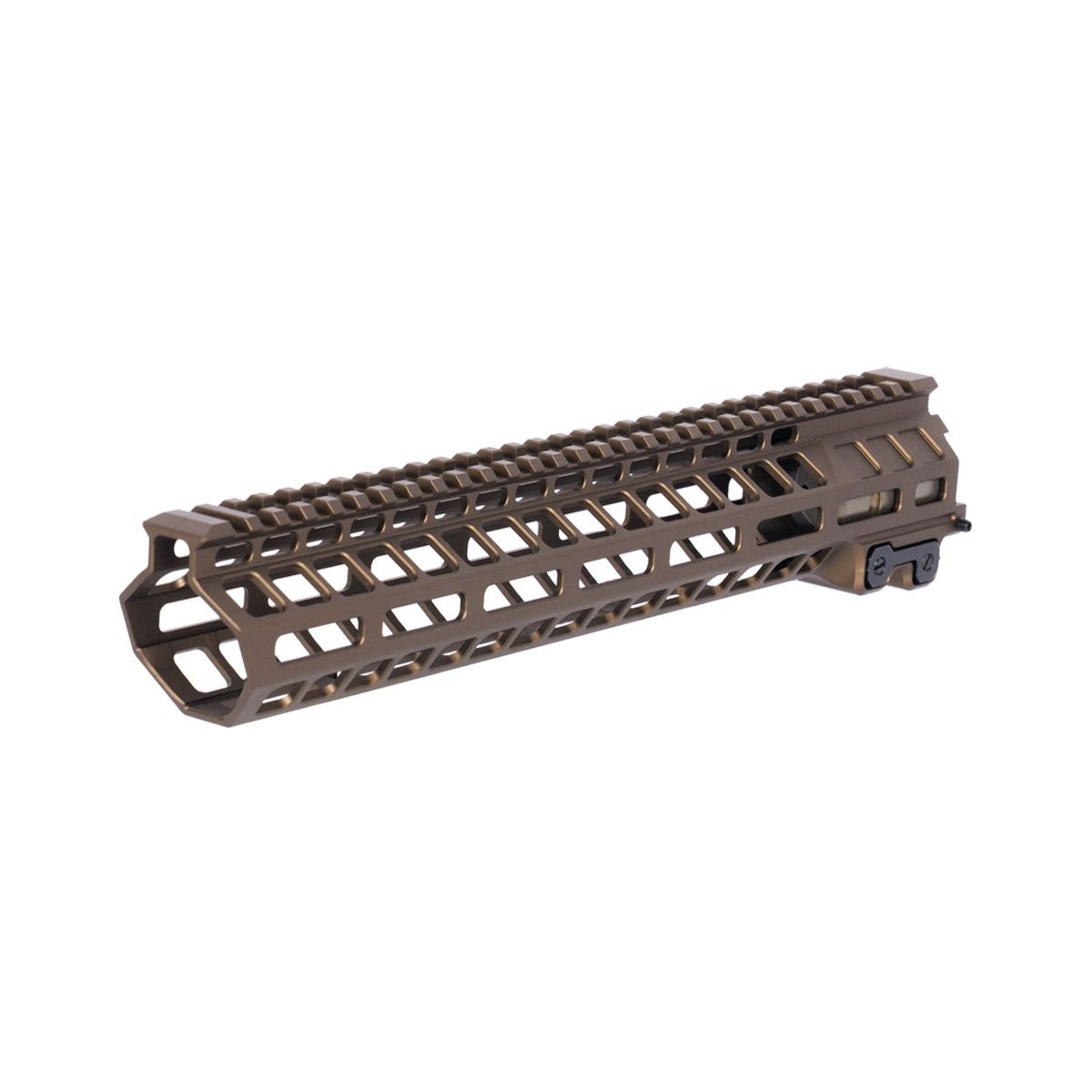 The Geissele 12.6" MK20 Dual Tab DDC Handguard Assembly is a modular free‑float rail system engineered for AR‑15 pattern rifles where a balance of rigidity, weight savings, and accessory mounting flexibility is desired. Built from high‑strength 7000 series aluminum and finished in durable Desert Dirt Color (DDC) Type 3 hardcoat anodize, this 12.6 inch handguard employs a dual anti‑rotation tab clamp system that securely engages the included proprietary Geissele barrel nut to prevent rotation under heavy use. With M‑LOK slots at the 3, 6, and 9 o’clock positions and a continuous Picatinny rail at the 12 o’clock position, it offers robust mounting options for optics, lights, grips, and other accessories. The assembly maintains a slim, lightweight profile while delivering the strength and versatility expected from Geissele’s MK20 platform.