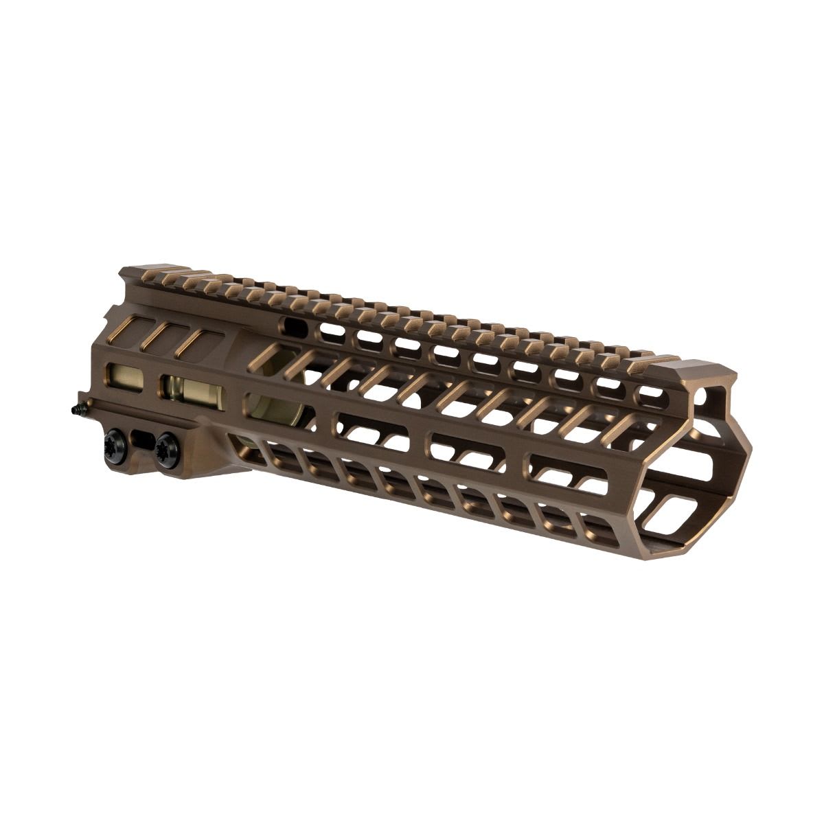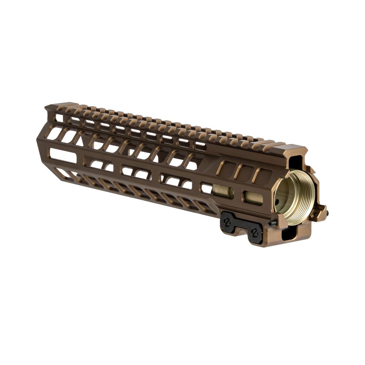 The Geissele 9.6" MK20 Dual Tab DDC Handguard Assembly is a lightweight, rugged free‑float handguard designed to provide a strong and modular accessory mounting platform for AR‑15 rifles. Built from high‑strength 7000 series aluminum with a Desert Dirt Color (DDC) Type III hardcoat anodized finish, the MK20 offers an exceptionally stiff and reliable interface even under heavy accessory load thanks to its dual anti‑rotation tabs and dedicated barrel nut design. M‑LOK slots on the 3, 6, and 9 o’clock positions allow versatile attachment of lights, grips, and other gear, while a continuous M1913 Picatinny rail on top supports optics and backup sights. Despite its strength and modularity, this handguard emphasizes weight savings — making it ideal for builds where a lightweight yet robust rail system is desired.