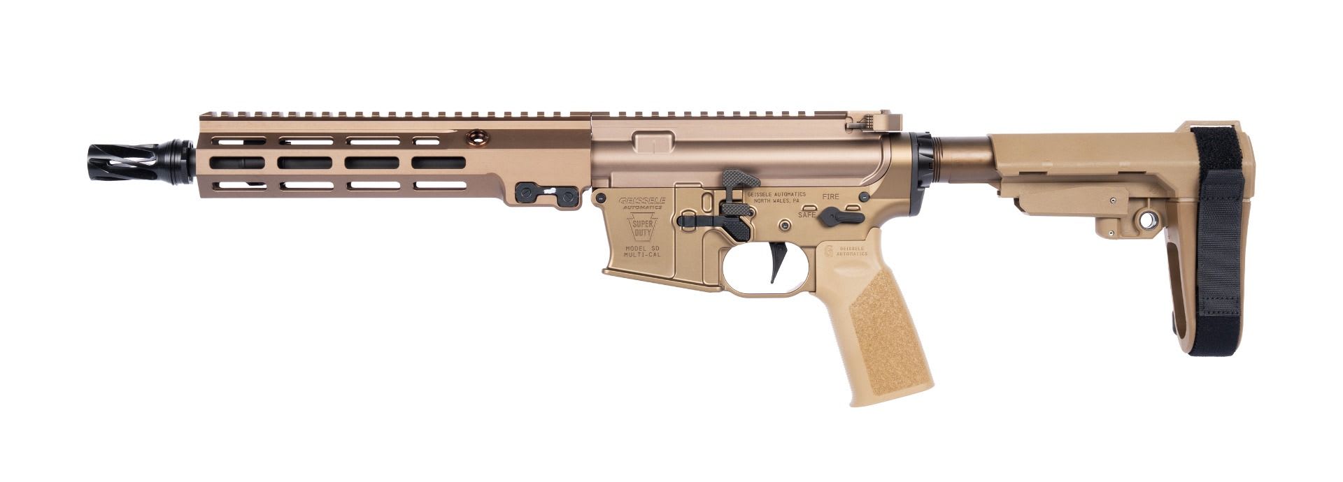 The Geissele Super Duty MOD1‑A 5.56mm 11.5" Ambidextrous DDC Pistol is a premium AR‑pattern firearm engineered for reliability, durability, and precision performance. Built around Geissele’s Super Duty platform, it features an 11.5in barrel optimized for maneuverability while maintaining ballistic effectiveness, paired with a rugged free‑float M‑LOK handguard for accessory mounting and enhanced control. The fully ambidextrous design improves handling for both left‑ and right‑handed shooters, while Geissele’s high‑quality internal components—including its precision trigger system and reliability‑focused bolt carrier group—deliver consistent cycling and accuracy. Finished in Geissele’s signature Desert Dirt Color (DDC) anodizing, this pistol offers corrosion resistance, reduced glare, and a distinctive appearance suited for professional, defensive, or range applications.