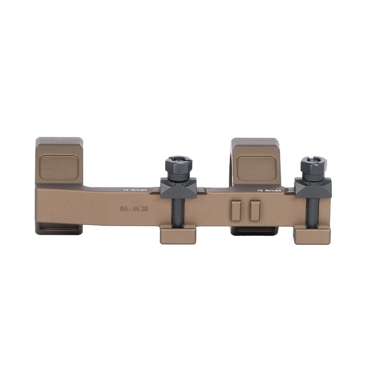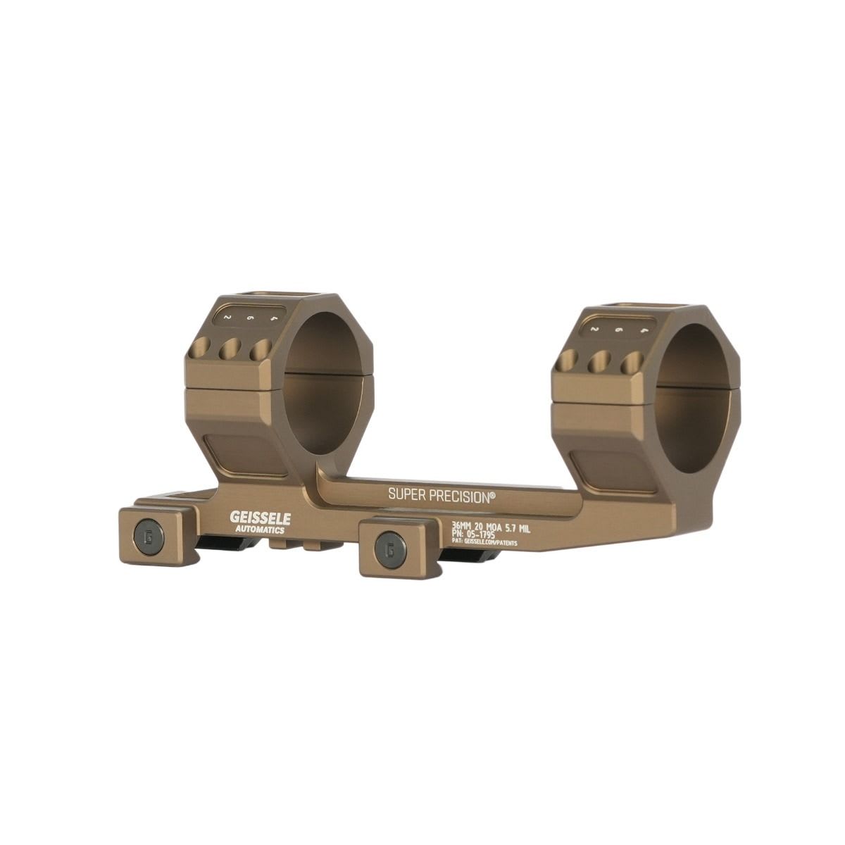 The Geissele Super Precision 36mm DDC Zero Compromise Scope Mount is a high-end precision scope mount engineered for rigorous long-range applications and premium optics such as the Zero Compromise ZC420 series. Built from a single billet of 7075-T6 aluminum and finished in a rugged Desert Dirt Color (DDC) Type III hardcoat anodize, this mount features a 36 mm ring size and a 20 MOA cant to extend usable elevation when engaging targets at extreme distances. Its extended cantilever design and precision machined shear lugs ensure the optic is positioned for ideal eye relief without requiring a forward bridge, while the Geissele precision clamp system — utilizing nut and bolt attachment — produces exceptionally high clamping force and return-to-zero reliability under recoil and abuse. With a centerline height of 1.54 in and a robust design tailored to precision shooters, the 05-1795S offers rock-solid performance for demanding riflescope setups.