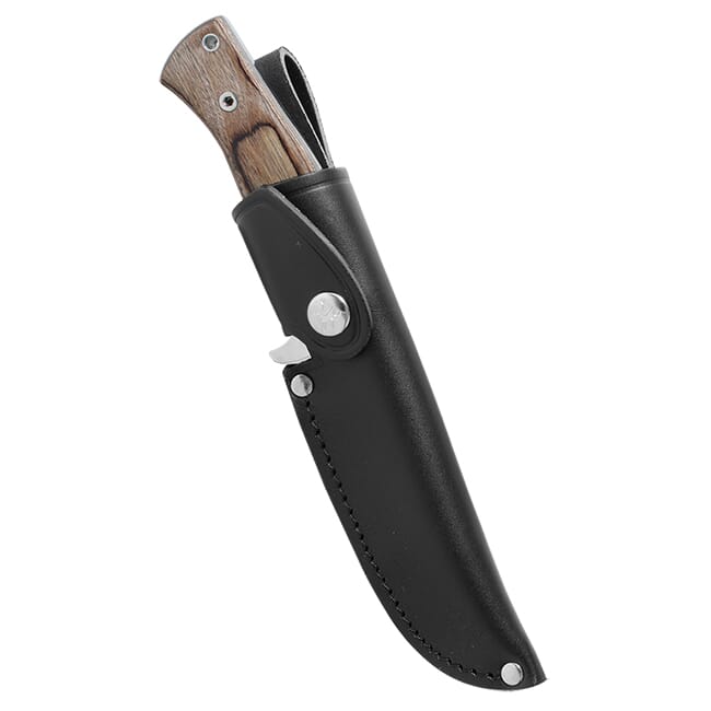 The contoured handle of the GRS Femund is designed to give the user a comfortable but stable grip on the knife and features the same laminated birch wood found on GRS stocks. The hardware on the handle of the knife consists of two large hex bolts, steel tube protecting the lanyard hole, and a polished finger-guard. The GRS Femund knife has classic black ox leather sheath with retaining strap.