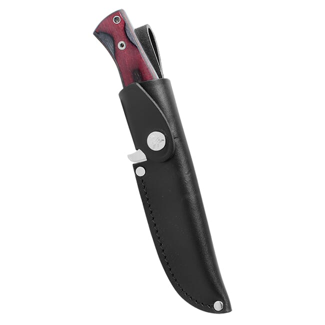 The contoured handle of the GRS Femund is designed to give the user a comfortable but stable grip on the knife and features the same laminated birch wood found on GRS stocks. The hardware on the handle of the knife consists of two large hex bolts, steel tube protecting the lanyard hole, and a polished finger-guard. The GRS Femund knife has classic black ox leather sheath with retaining strap.